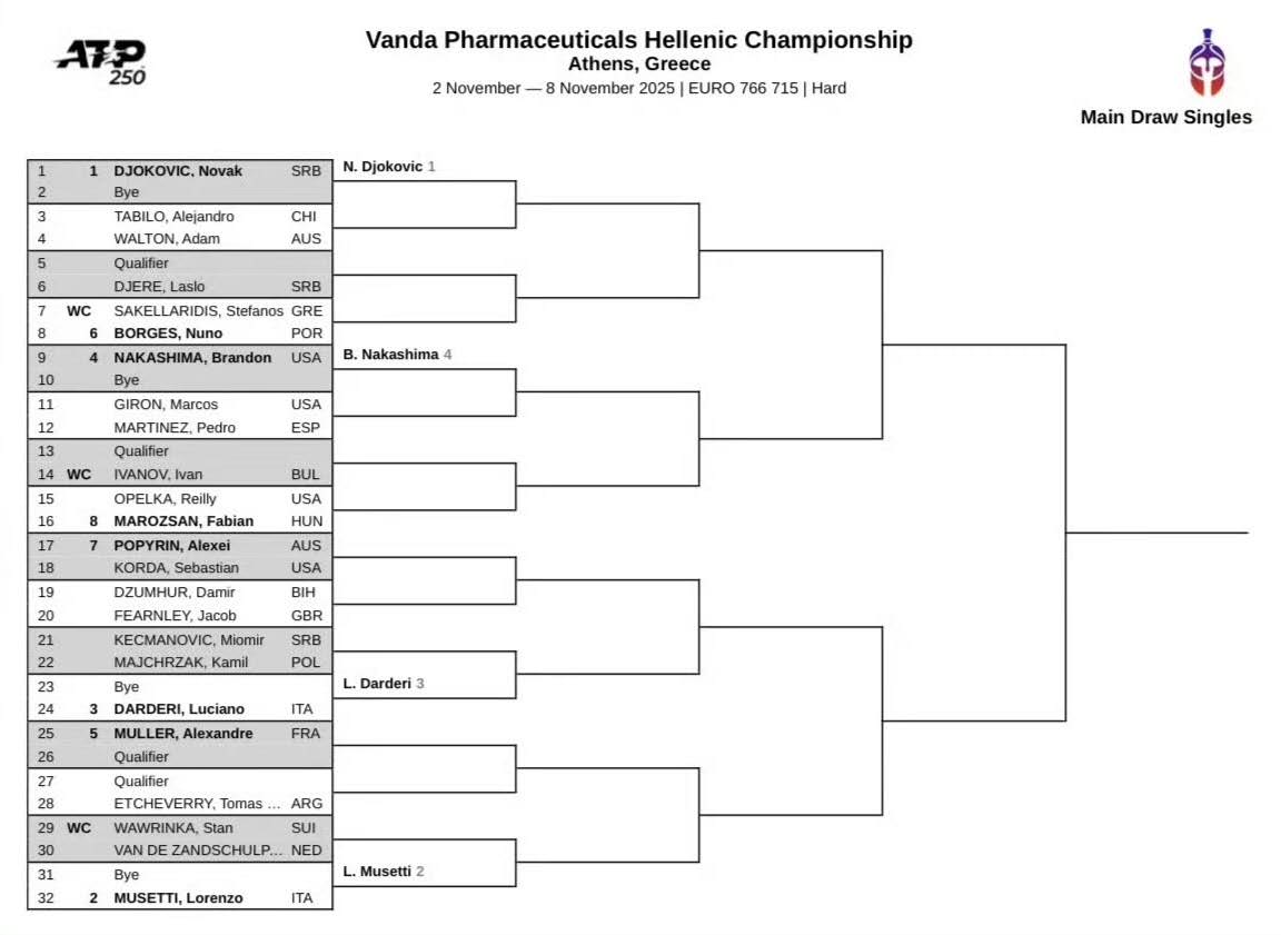 Musetti’s journey in Athens promises to be tough. As the second seed, he has a first-round bye but could face strong opponents like Stan Wawrinka or Van de Zandschulp next; the quarterfinals might pit him against Jan-Lennard Struff or Alexander Müller; potential semifinal opponents include Andrej Džadrić or Sebastian Korda; and the most daunting challenge could come in the final against top seed Djokovic.