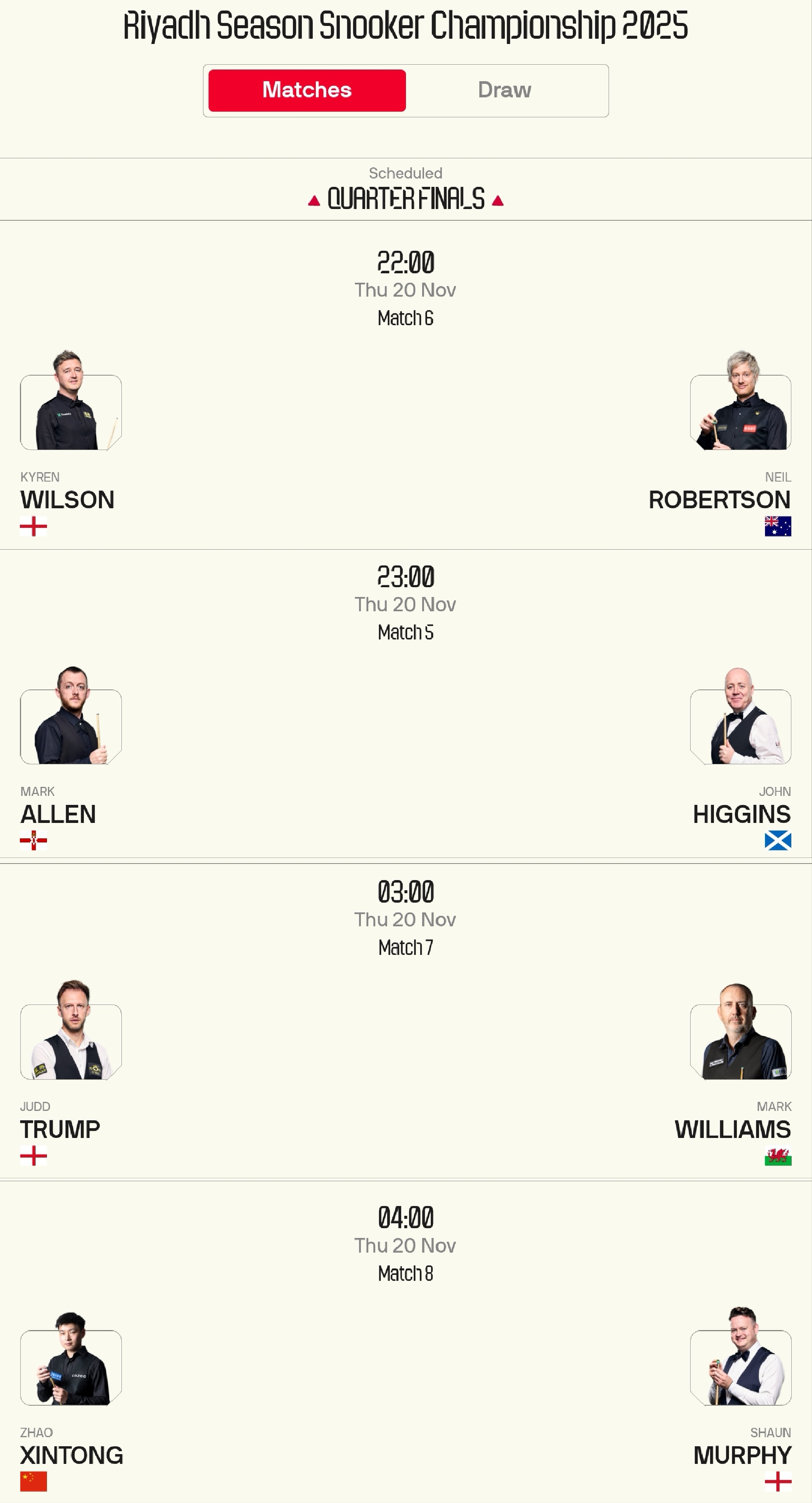 The Snooker Saudi Championship schedule for today (2025.11.20) features four quarterfinal matches, with eight top 10 players including Zhao Xintong and Higgins participating, streamed on Migu Video and Huya.