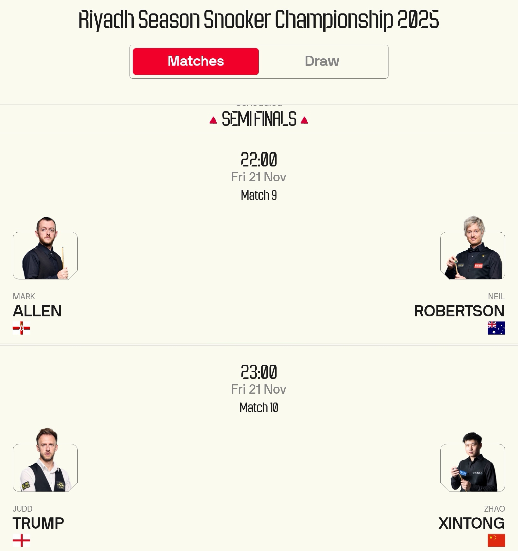 The Snooker Saudi Championship matches today (2025.11.21) feature Zhao Xintong, Mark Allen, Neil Robertson, and Trump, with live coverage on Migu Video and Huya.