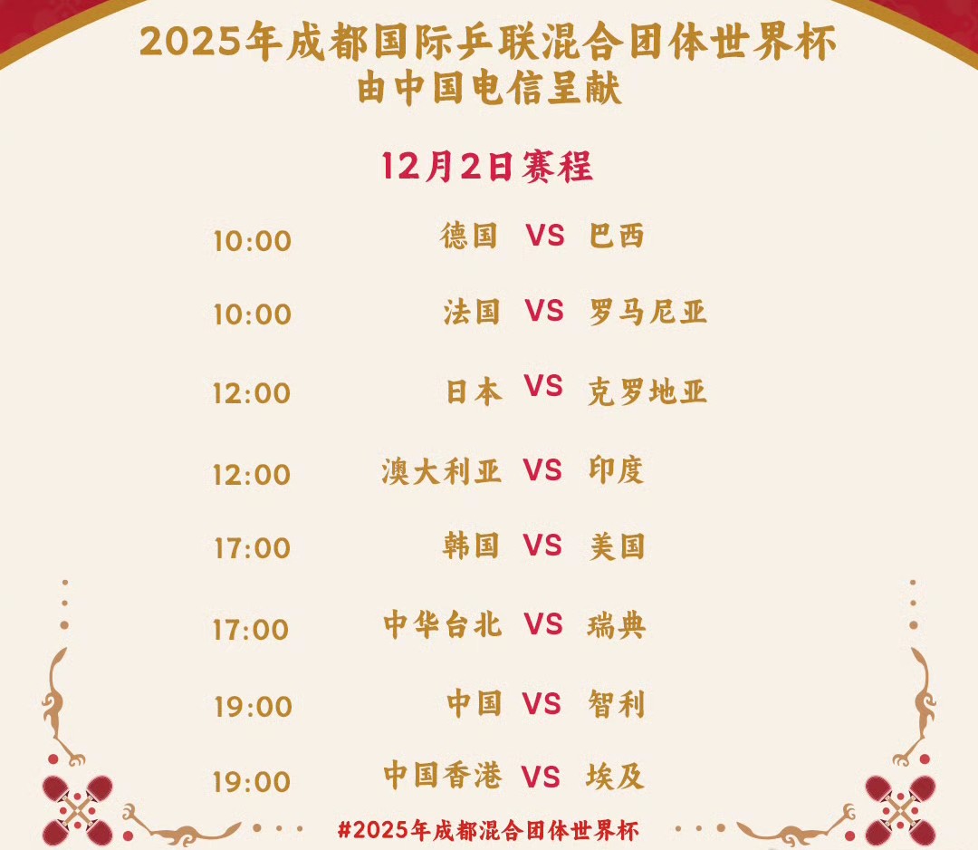 Tomorrow’s Table Tennis Chengdu Mixed Team World Cup schedule (2025.12.2) includes China versus Chile, live on CCTV-5 and Yangshipin.