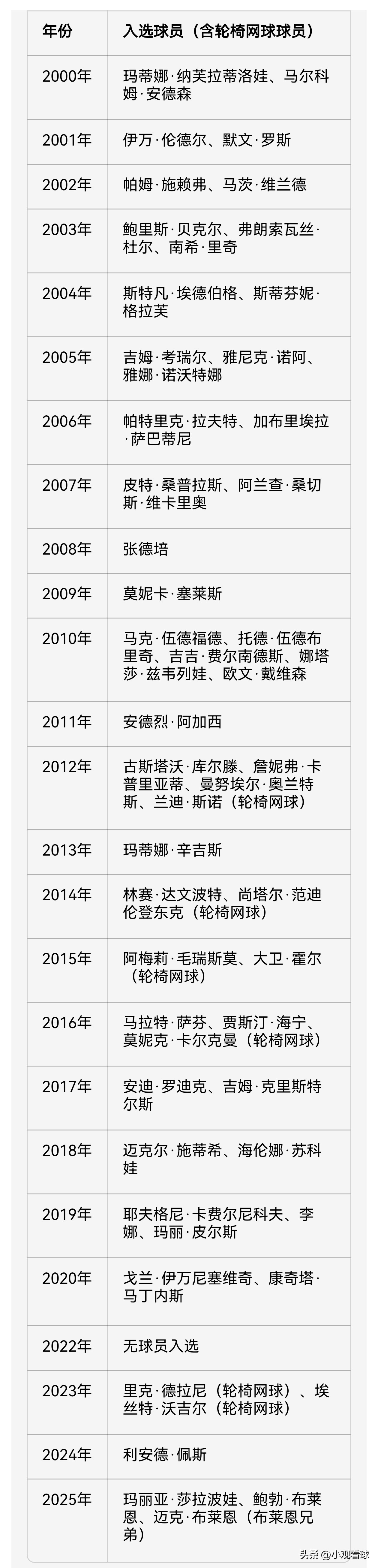 - Inductee List : Since 1955, members have been inducted, including tennis legends like Agassi, Sampras, and Li Na. Li Na became the first Asian inductee in 2019. In 2024, Sharapova and the Bryan brothers were inducted,and Federer has also been confirmed as an inductee, with his induction ceremony scheduled for August 27-29, 2026.