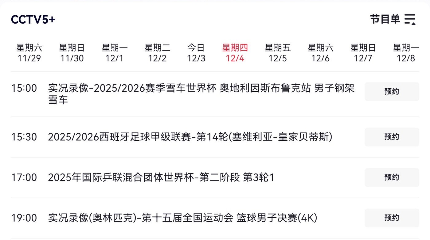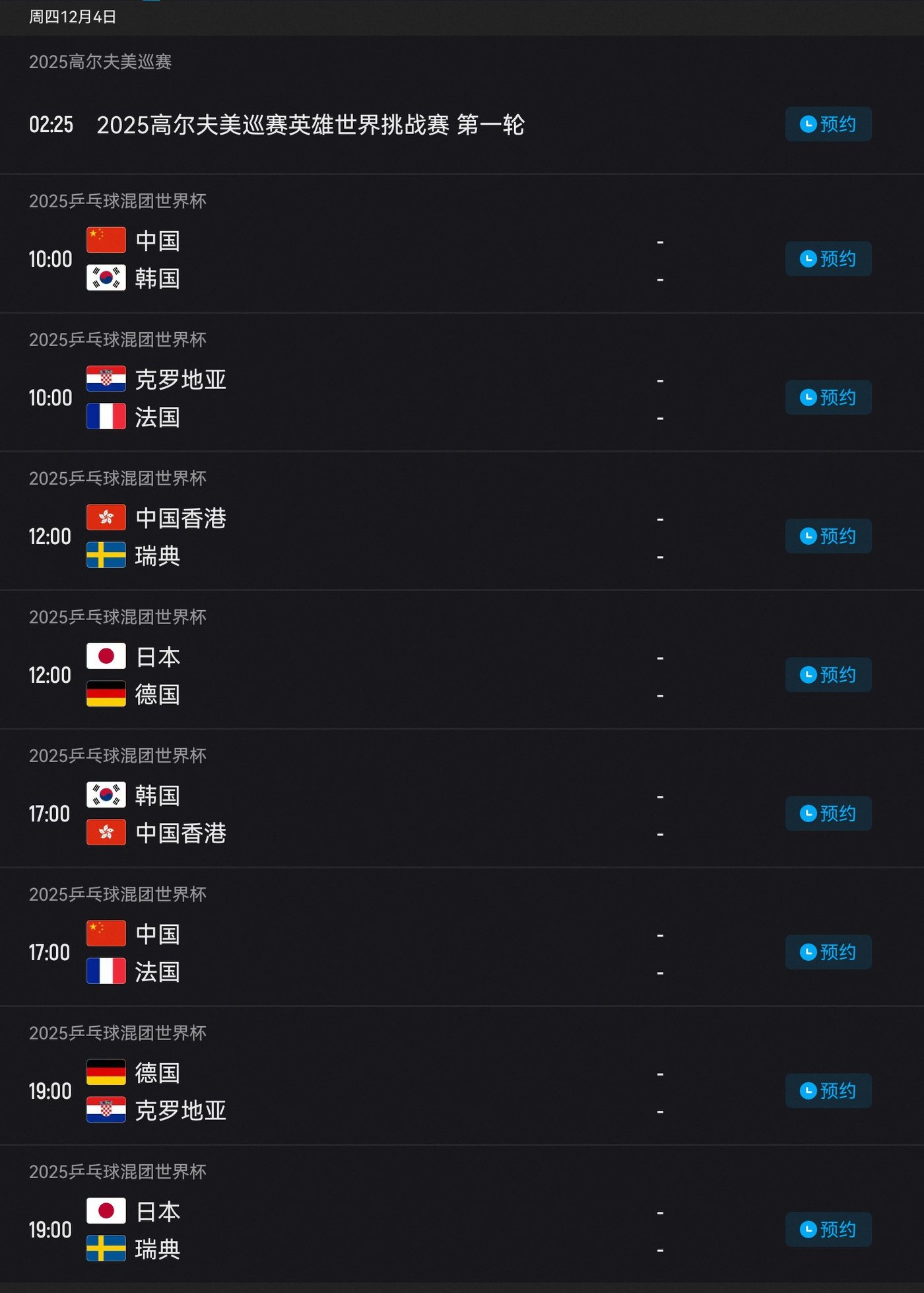 The Table Tennis Mixed Team World Cup schedule for tomorrow (2025.12.4) includes China playing against South Korea and France, with two matches in one day, broadcast on CCTV-5 and CCTV video platform.