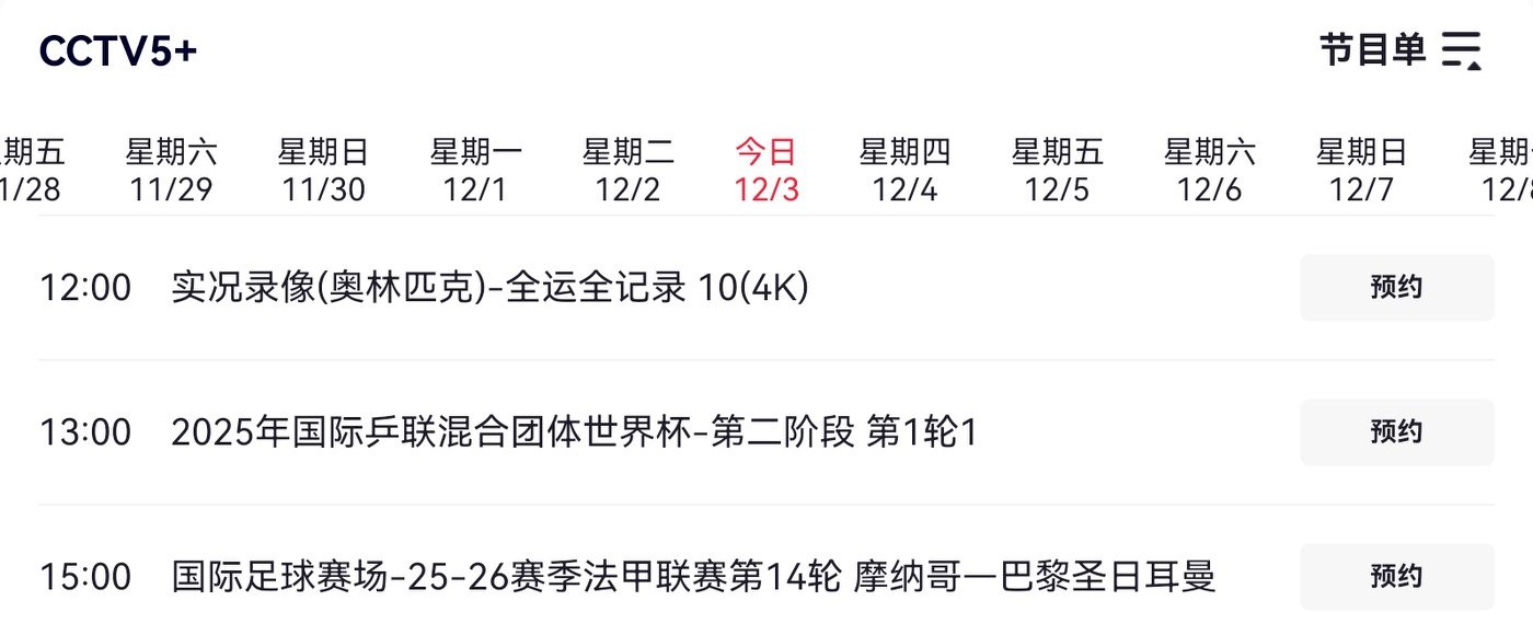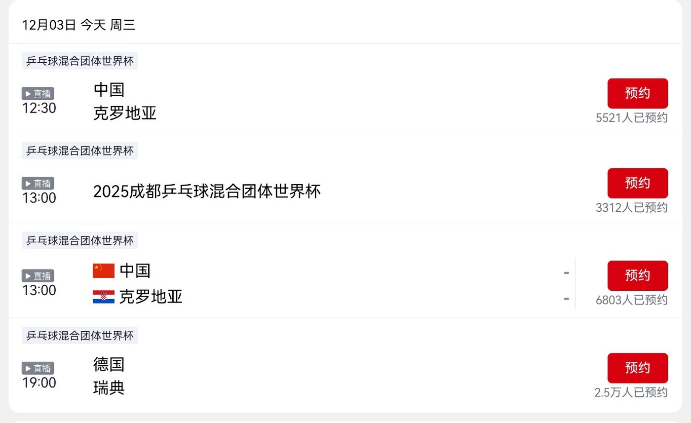 Today's schedule for the Table Tennis Mixed Team World Cup (2025.12.3) includes China vs. Croatia, live on CCTV-5+.