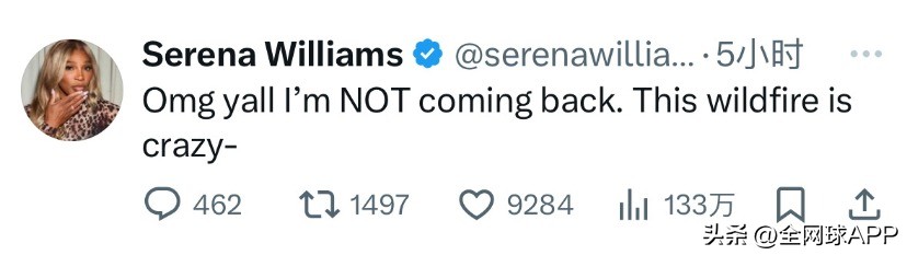 In the early hours today Beijing time, Serena Williams personally took to social media to dispel the rumors, firmly denying any comeback: "Oh my god, I am not coming back. This has gotten way out of hand."