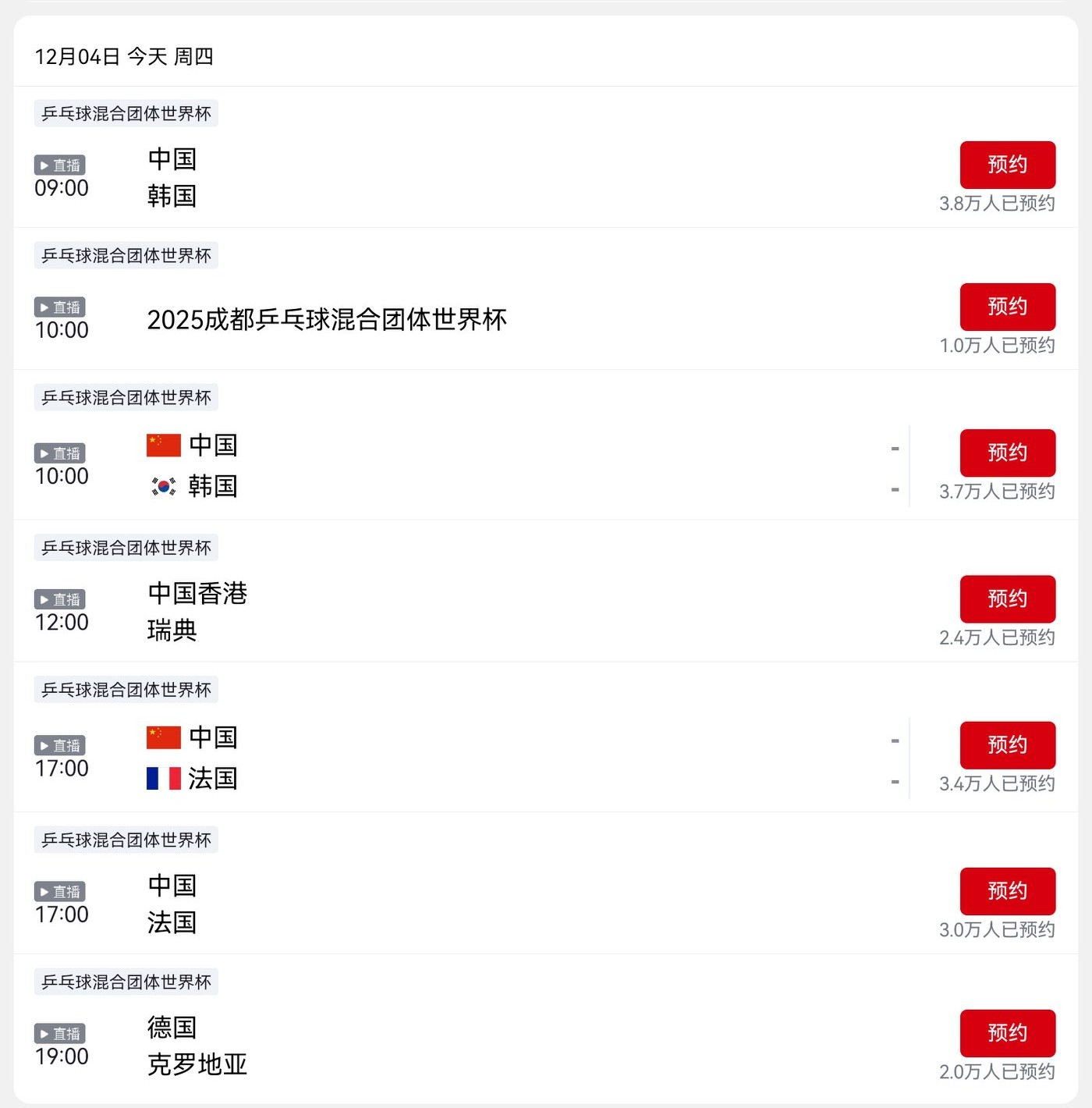 Table Tennis Mixed Team World Cup Schedule for Today (2025.12.4): China has two matches in one day, fully live on CCTV-5.