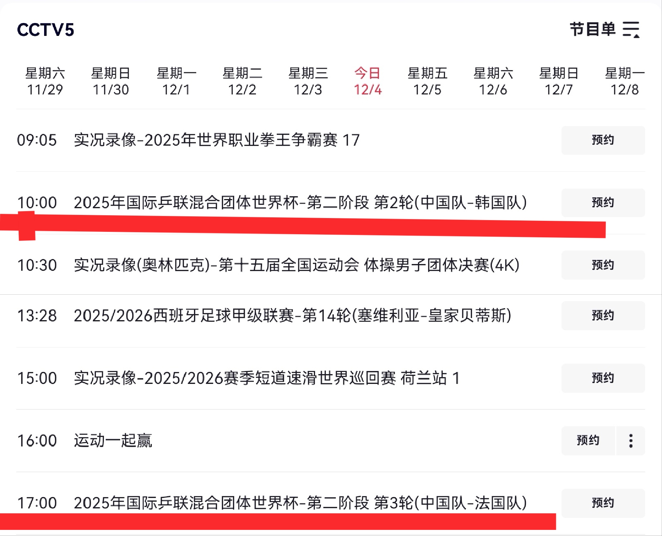 The detailed CCTV-5 live broadcast schedule is shown below.