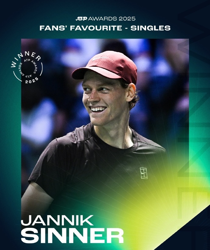 Next, let’s look at the ATP 2025 annual awards. After a week of voting, all results were announced last night Beijing time. Italy’s top player Sinner won the ATP Most Popular Singles Player award for the third consecutive year.