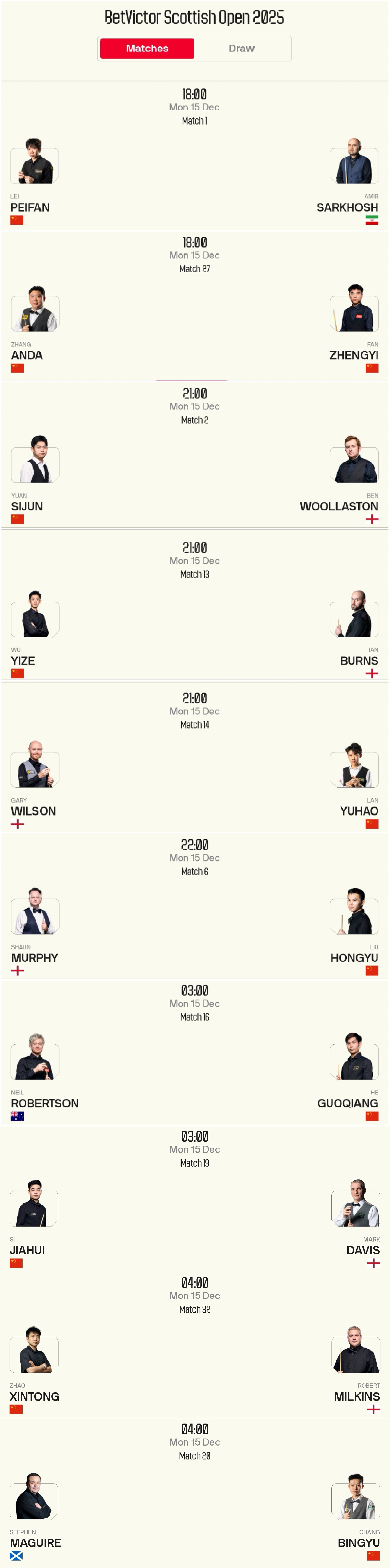 The Snooker Scottish Open schedule for tomorrow (2025.12.15) includes 11 players such as Zhao Xintong, Wu Yize, and Si Jiahui competing, broadcast live on Huya.
