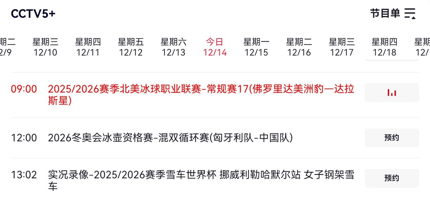 The curling Winter Olympics qualifier mixed doubles B group round-robin match between China and Hungary is scheduled for today (2025.12.14), with live broadcasts on CCTV-5+ and CCTV Video.