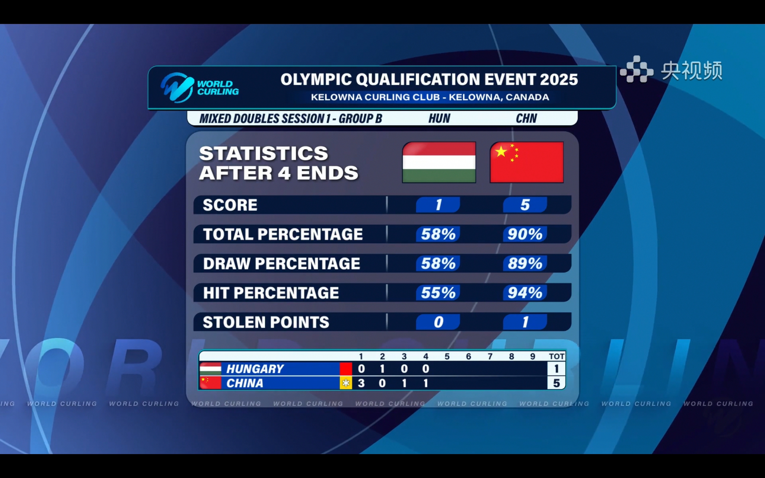 CCTV-5+ and Yangshipin are currently airing the mixed doubles round-robin curling Olympic qualifier match between China and Hungary.
