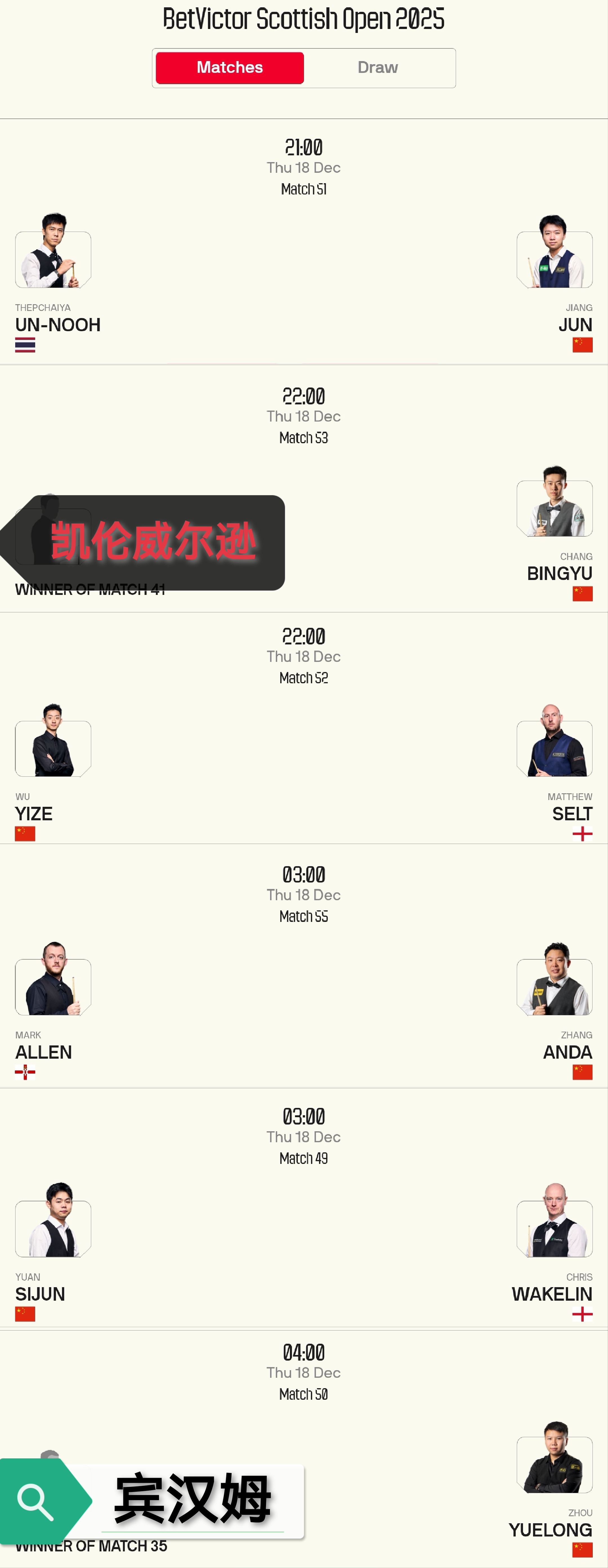 Today’s (2025.12.18) Snooker Scottish Open schedule features six players including Wu Yize and Zhou Yuelong, with live coverage on Migu Video and Huya.