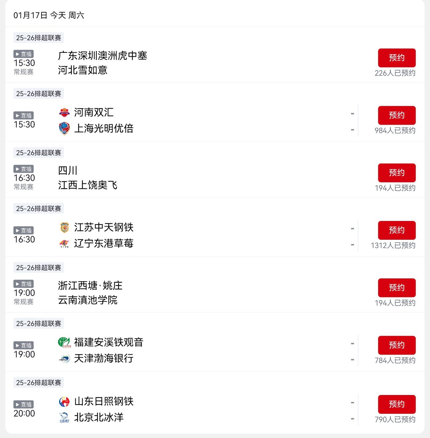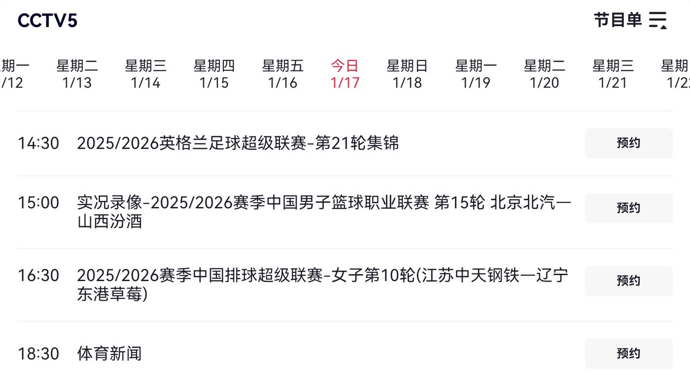 The Volleyball Super League schedule today (1.17) features Tianjin, Shanghai, Jiangsu, and Shandong competing, with live broadcasts on CCTV-5+ and Yangshipin.