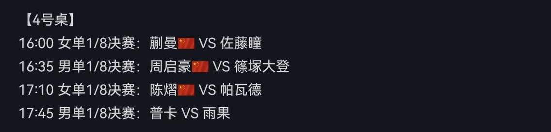 At Table 4, Kuai Man, Chen Yi, and Zhou Qihao will compete in three matches. We are confident that all three Chinese players will win and advance to the next round, as their opponents lack the strength to challenge them. What do you think?