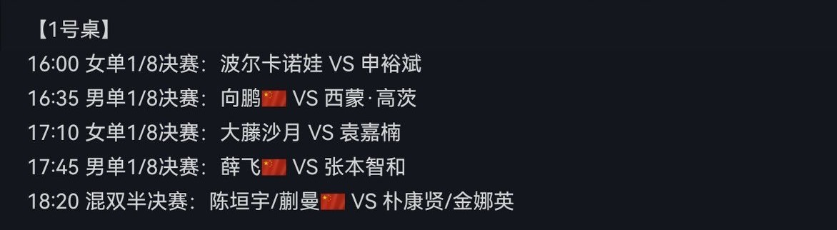 At Table 1, Xiang Peng, Xue Fei, and the mixed doubles duo Chen Yuanyu/Kuai Man will play three matches. Xiang Peng will fight hard and has a chance to defeat Simon Gauzy. Xue Fei has beaten Harimoto Tomokazu before, and we look forward to another win. The mixed doubles team Chen Yuanyu/Kuai Man is expected to win and advance to the finals.