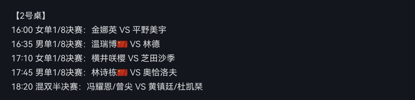 At Table 2, Wen Ruibo and Lin Shidong will play two matches. Wen Ruibo faces Lind, with little chance of winning. Lin Shidong will compete against Ovtcharov and is likely to advance.