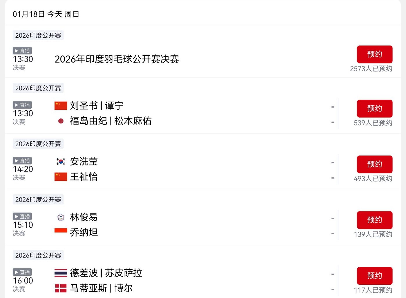 The Badminton India Open schedule for today (2026.1.18) shows China fighting for the championship with a contest for the top two spots, broadcast live on CCTV Video and Youku.