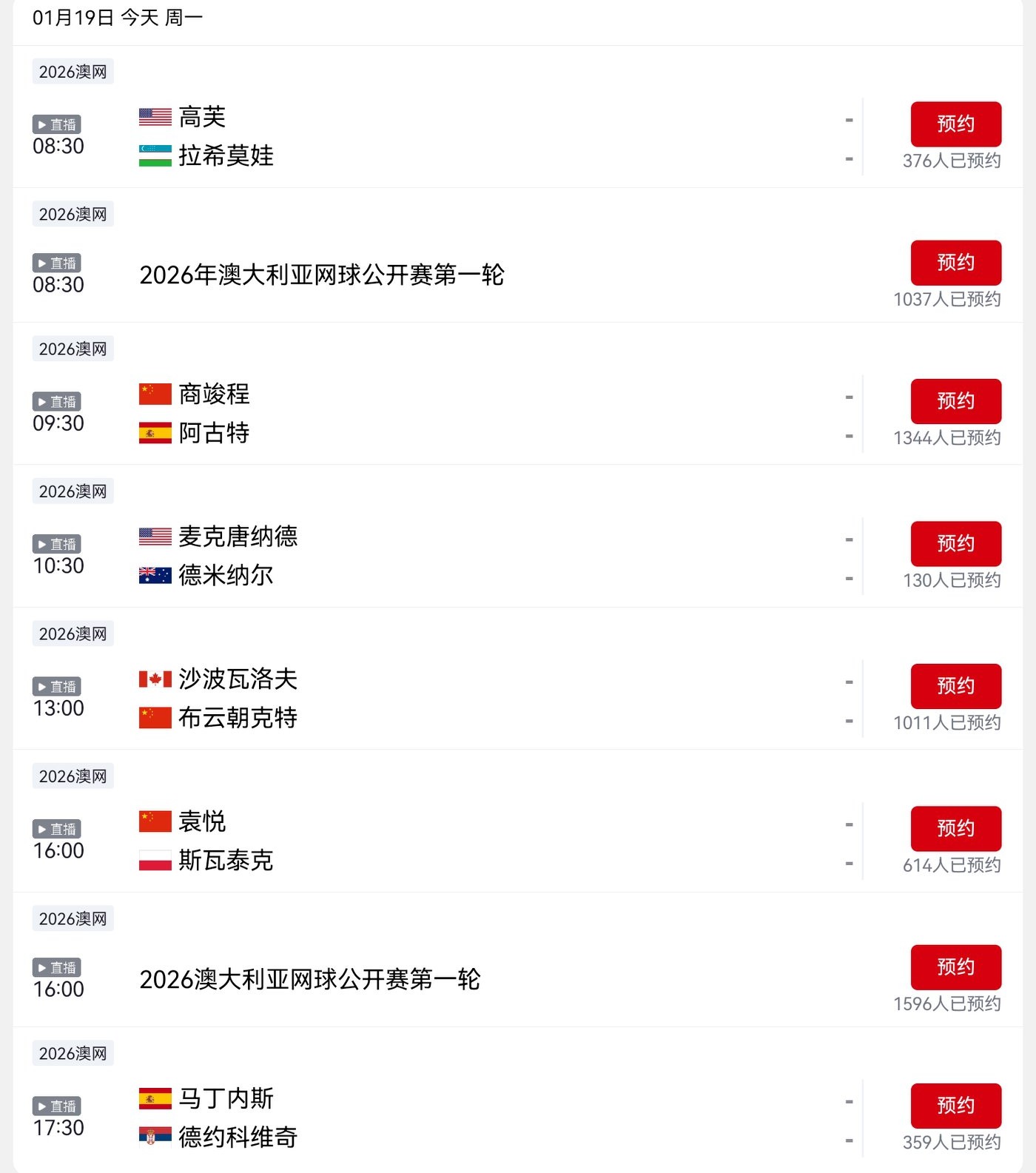 CCTV-5 and Yangshipin are offering free live coverage of the Australian Open match between Gauff and Rashimova, along with today's (2026.1.19) schedule.