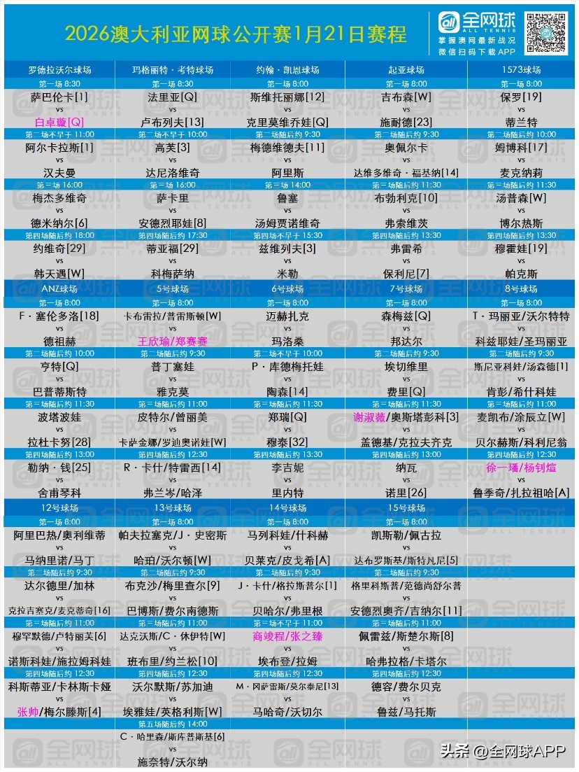 The fourth day schedule for the 2026 Australian Open is out, featuring Chinese athlete Bai Zhuoxuan competing at Rod Laver Arena against two-time tournament winner and reigning world No. 1 Sabalenka. On the doubles front, Wang Xinyu/Zheng Saisai, Xu Yifan/Yang Zhaoxuan, Shang Juncheng/Zhang Zhizhen, and Zhang Shuai/Mertens will all begin their campaigns in the opening round.