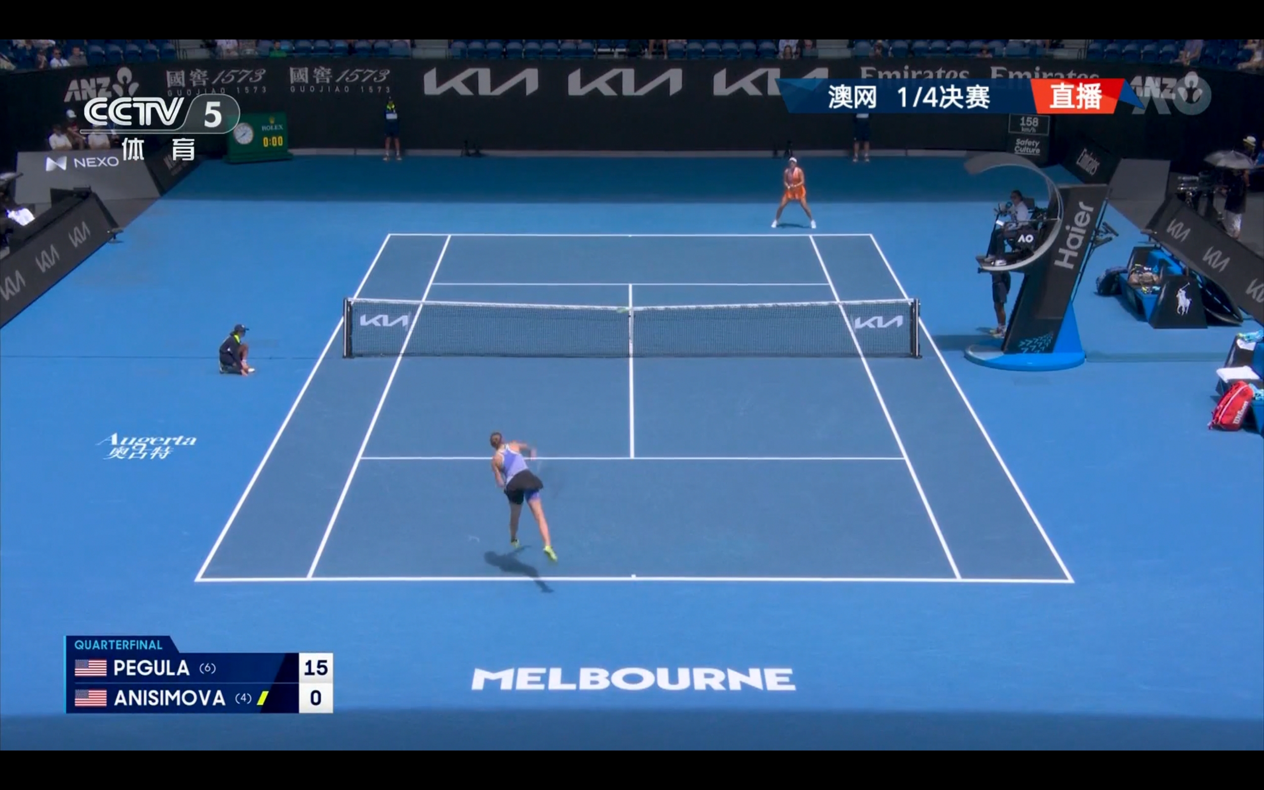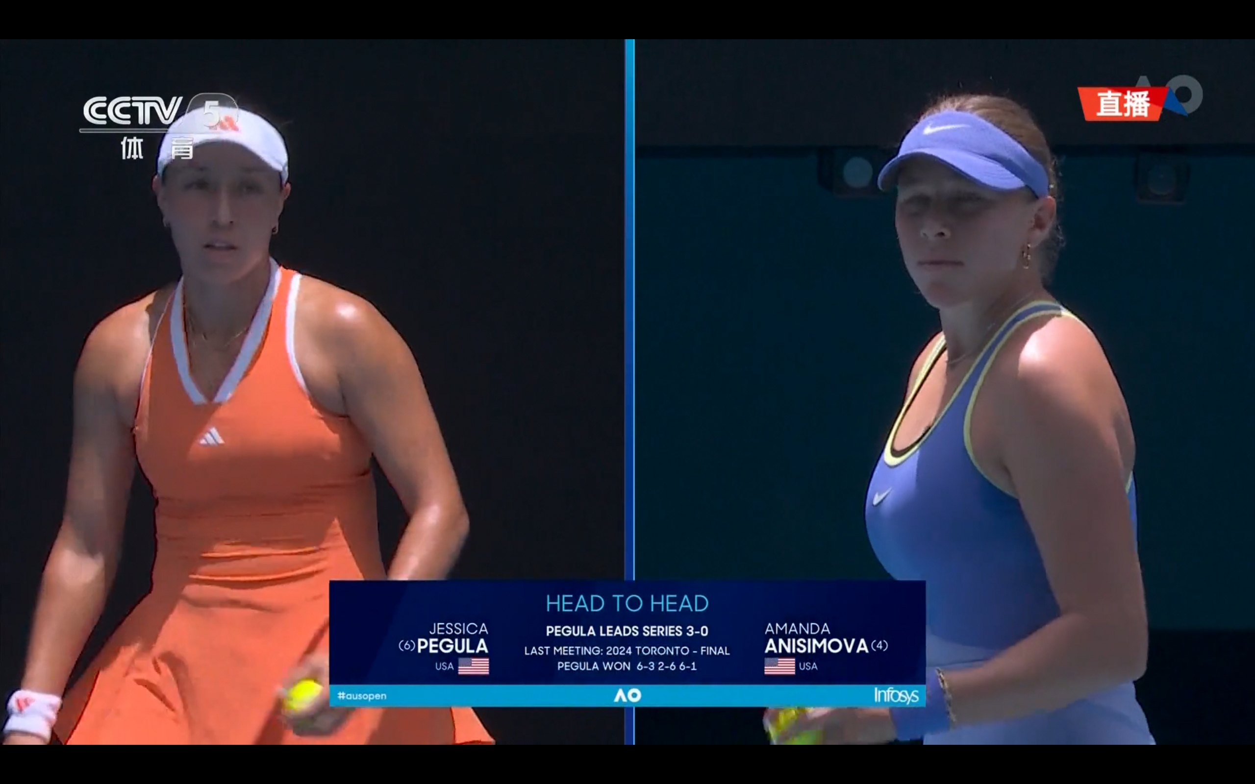 CCTV-5 and Yangshipin are providing free live coverage of the Australian Open women's singles quarterfinal between Pegula and Anisimova.