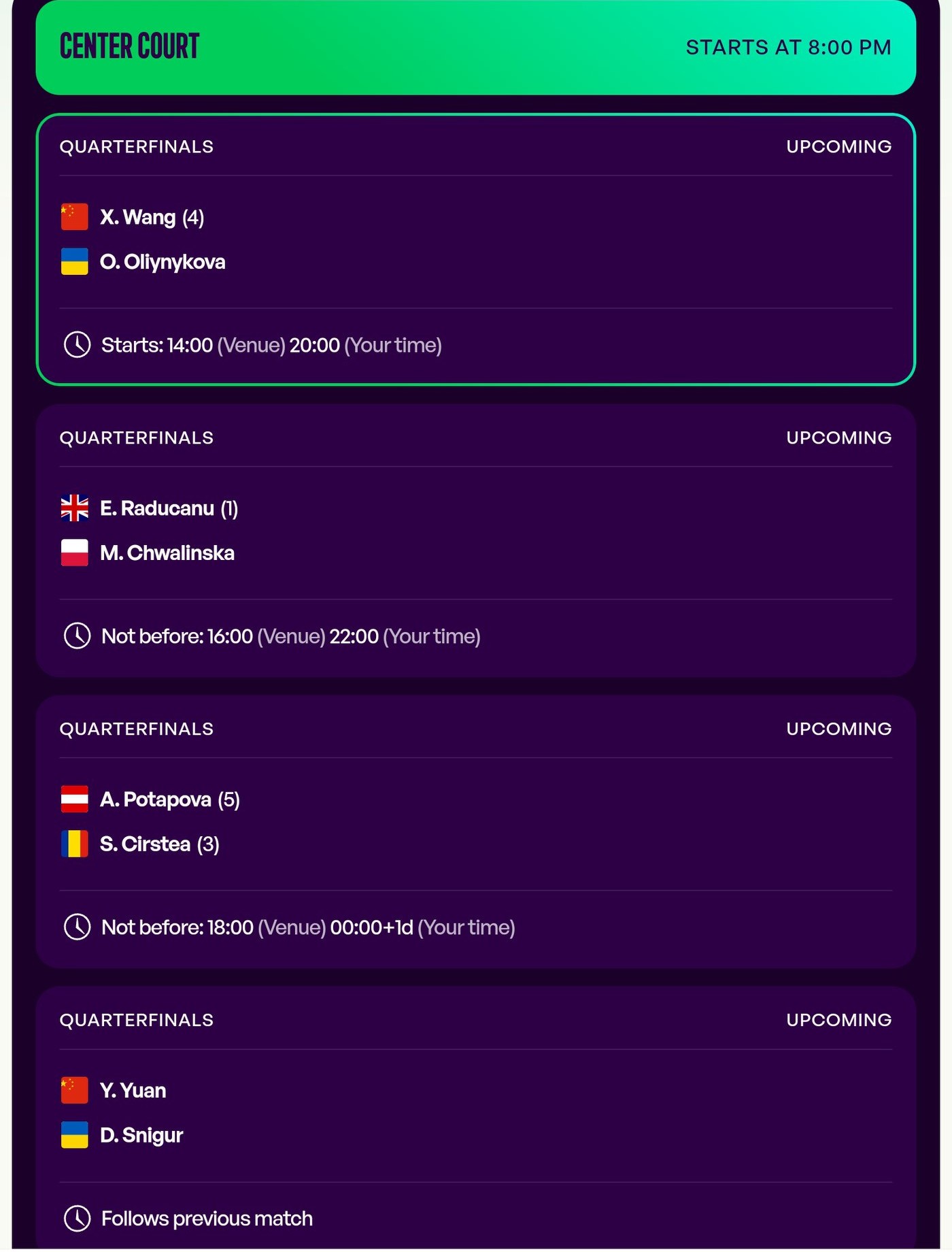 Around 2 AM tomorrow, the women's singles quarterfinal match:Yuan Yue versus Snihur.
