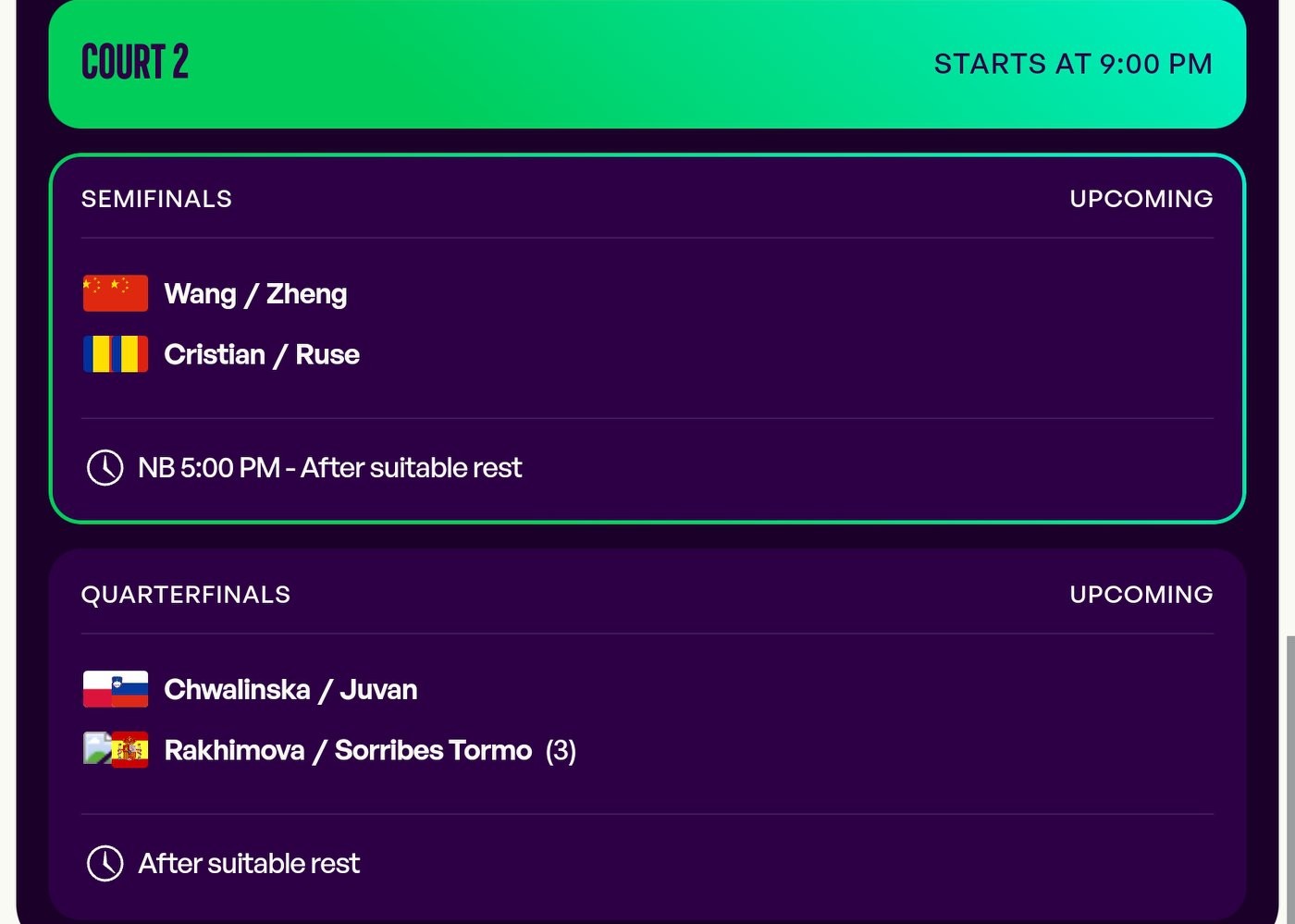 3. Women's doubles semifinals are scheduled for 9 PM tonight, featuring Wang Xinyu and Zheng Saisai.