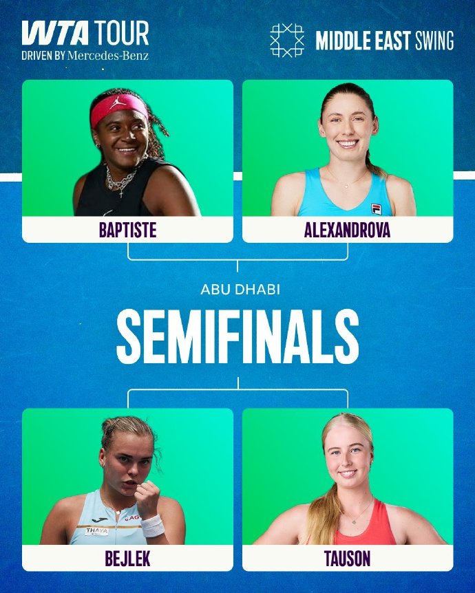 On the women's side: In the WTA500 Abu Dhabi quarterfinals, second seed and Russian veteran Alexandrova defeated the Philippines' top player Iela 6-3, 6-3 to reach the semifinals, where she will face American wildcard Baptiste, who upset fifth seed Russian Samsonova 6-2, 4-6, 6-4. Baptiste has now beaten two top-20 players this week and reached her first career tour semifinal. In the other two matches, qualifier Belec and Danish rising star Tauson each won to meet in the semifinals.