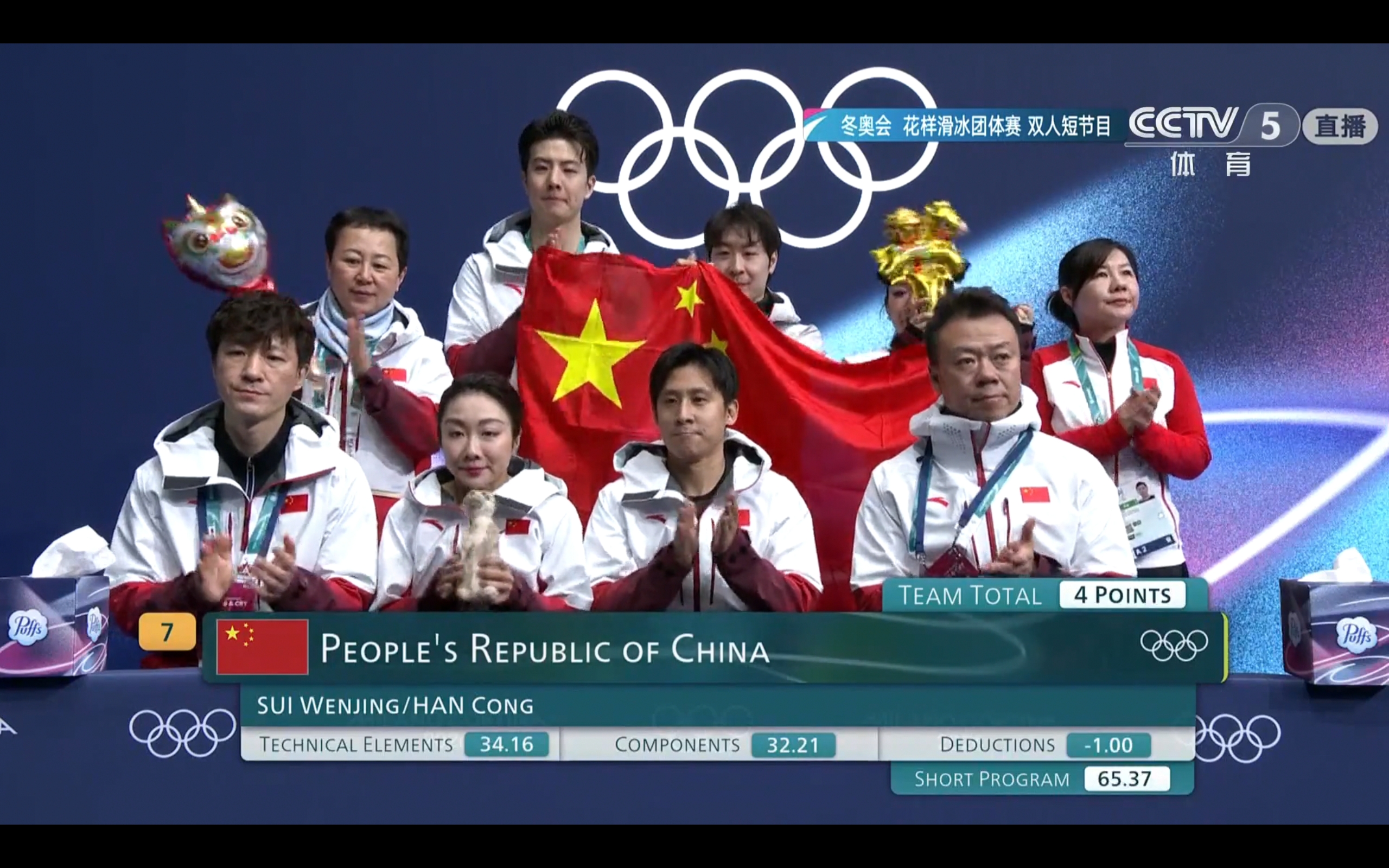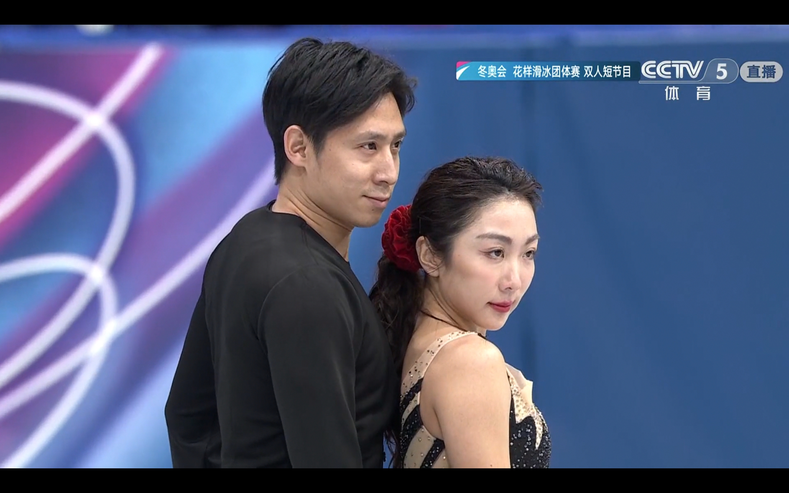 CCTV-5 is broadcasting live the Winter Olympics figure skating team event pairs short program, featuring Han Cong and Sui Wenjing.