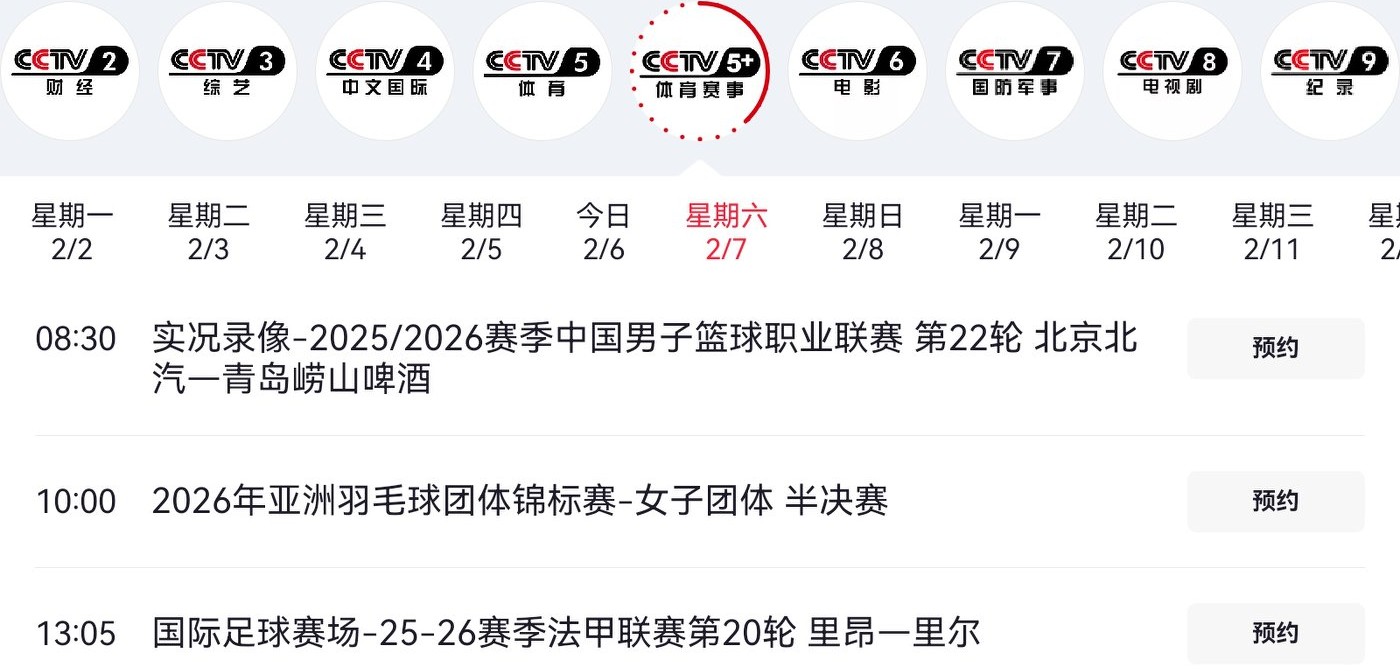 The Asian Badminton Team Championships schedule for tomorrow (2026.2.7) includes the semifinal between China and Chinese Taipei, live on CCTV-5+.