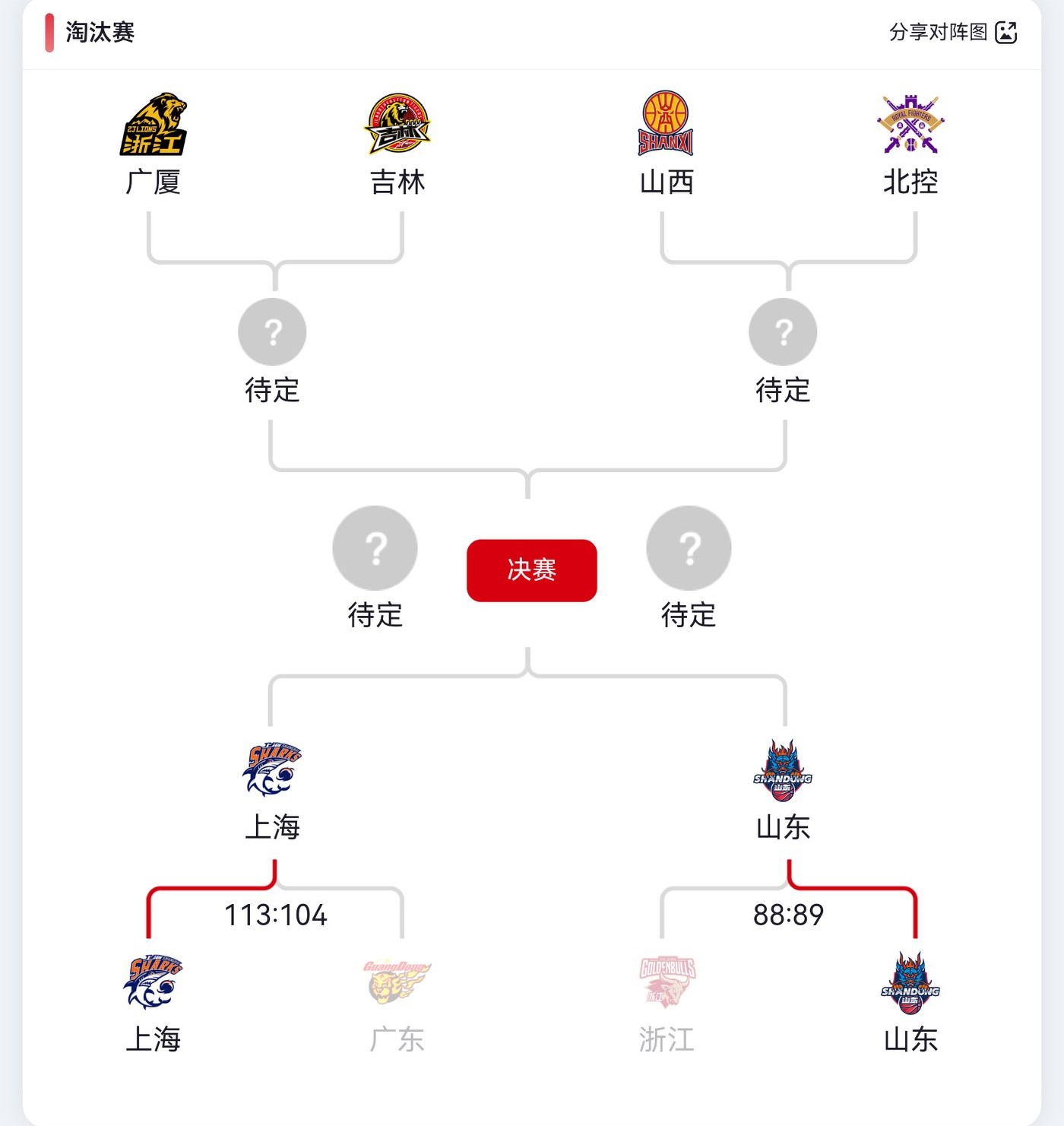 The detailed schedule for the CBA Club Cup knockout stage is shown below. Yesterday, Shanghai Jiushi eliminated Guangdong Dongyangguang, and Shandong Gaosu knocked out Zhejiang Chouzhou Jinzu, securing their spots in the semifinals.