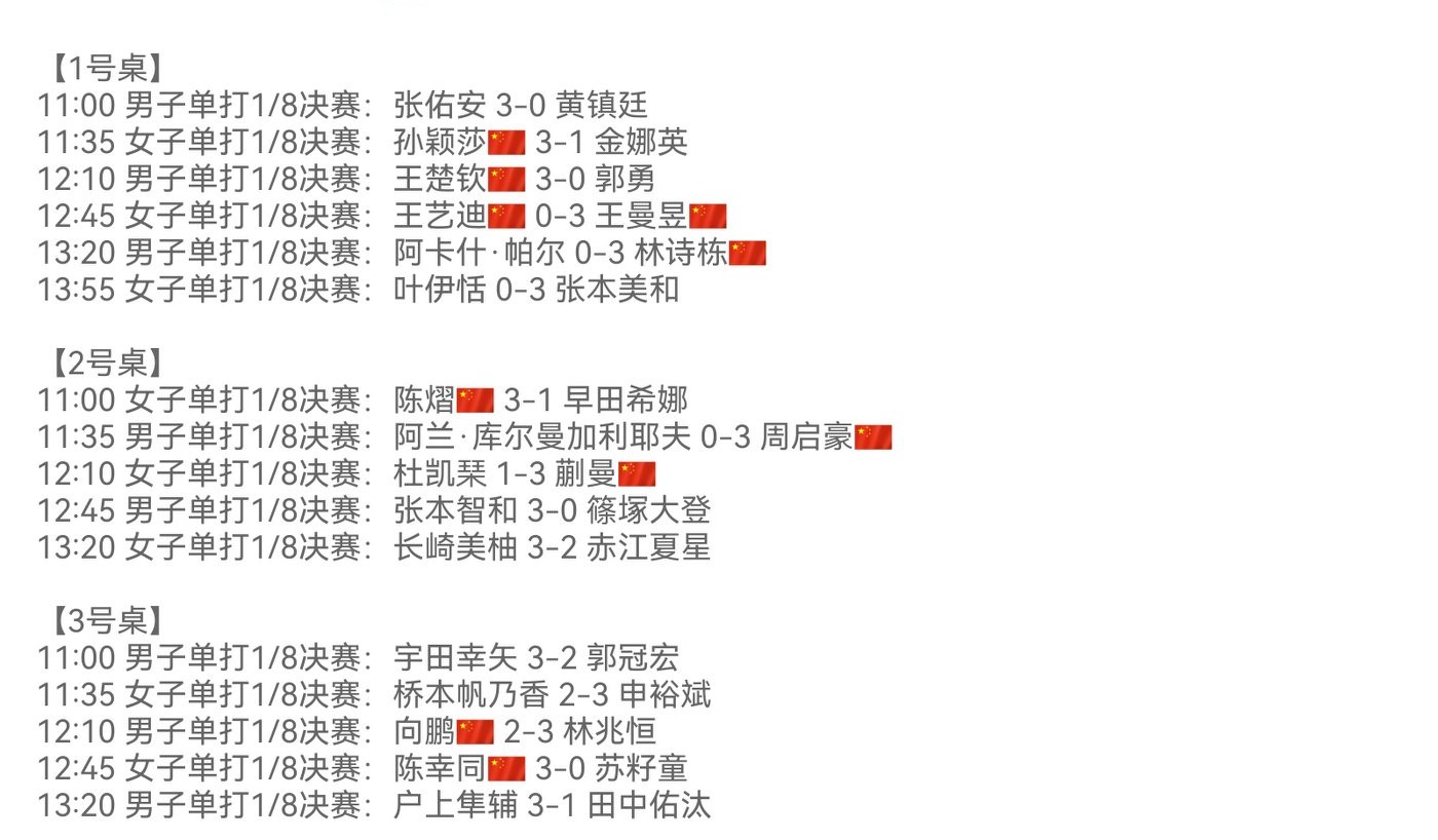 All Round of 16 matches have been completed with ten Chinese players participating; Wang Yidi and Xiang Peng were eliminated, and the remaining eight all reached the quarterfinals, as shown in the image below.