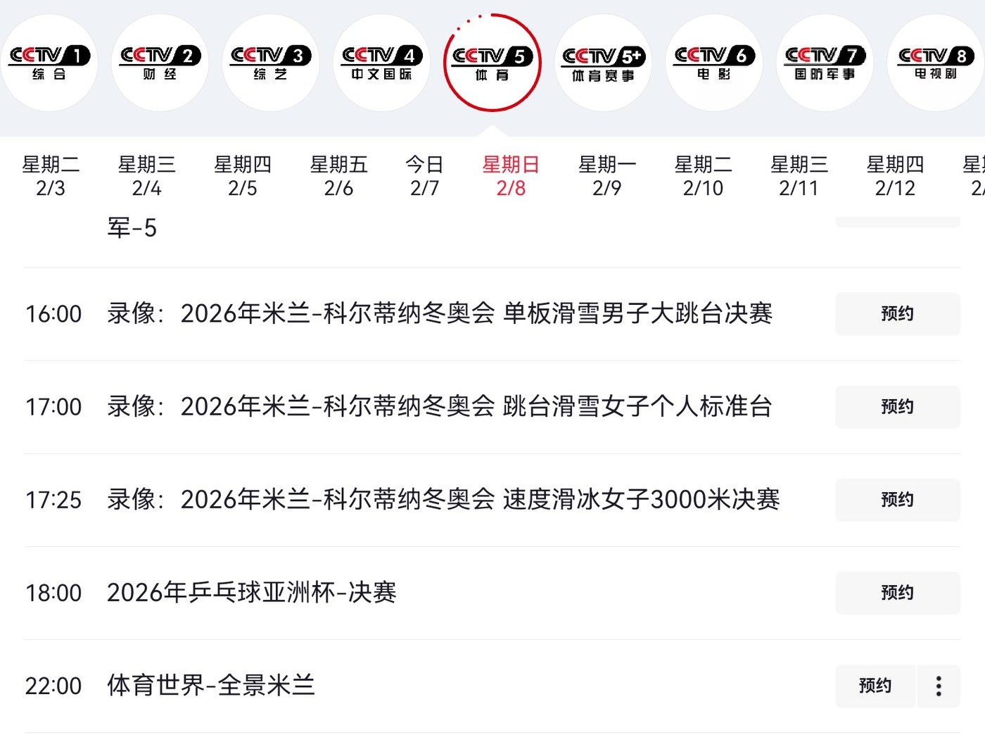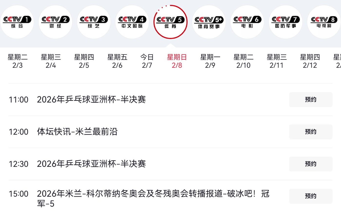 The Table Tennis Asian Cup schedule for tomorrow (2026.2.8) includes Wang Chuqin, Wang Manyu, Sun Yingsha, and Kuai Man competing, with live broadcast on CCTV-5.