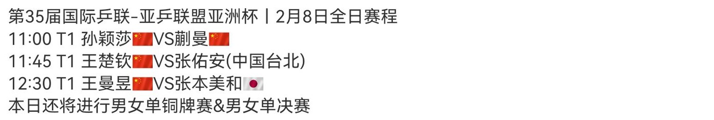 The Table Tennis Asian Cup schedule for tomorrow (2.8) features Wang Chuqin, Wang Manyu, and Sun Yingsha competing, with live coverage on CCTV-5.