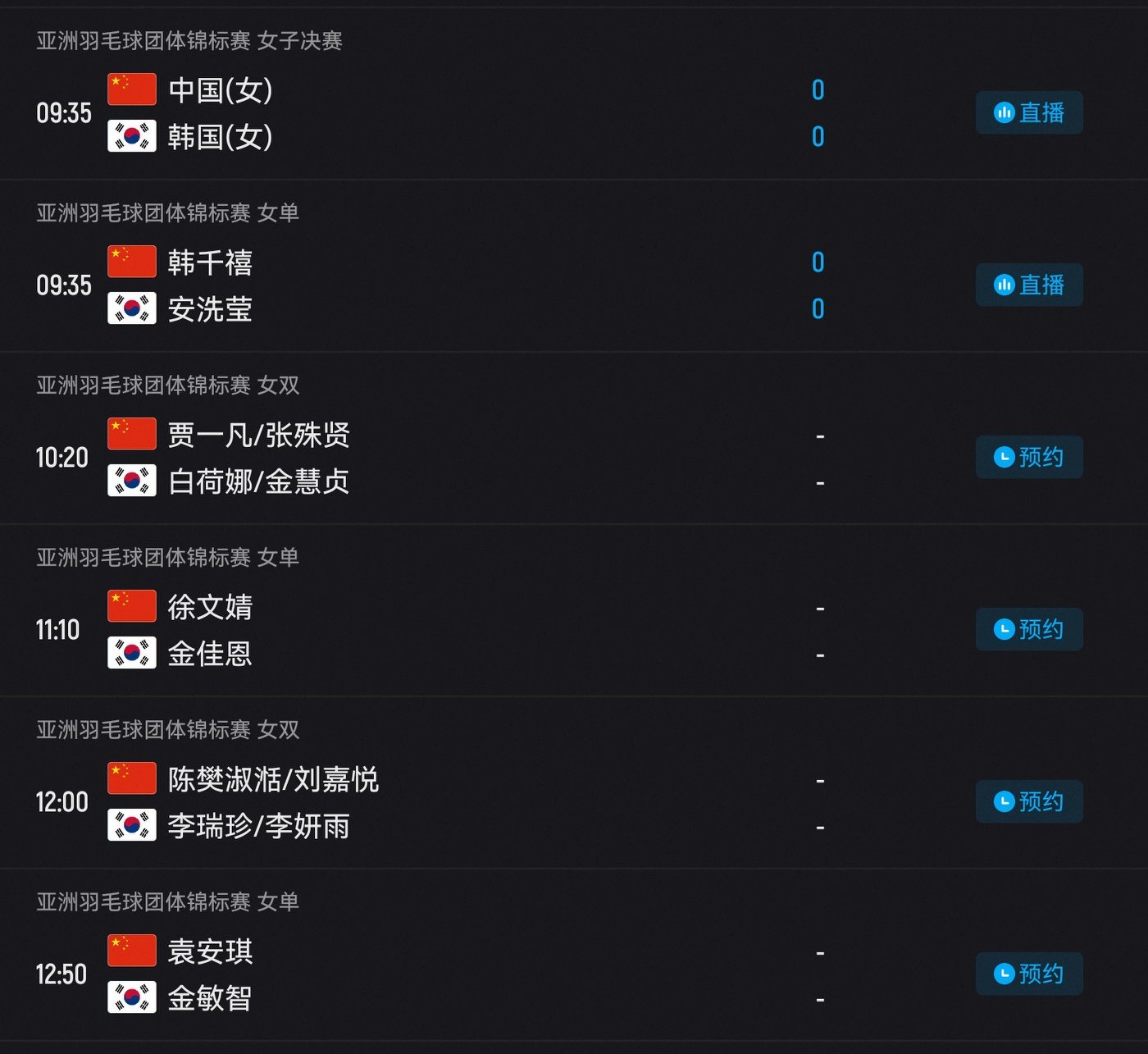 The match between China and South Korea in the Asian Badminton Team Championships Women's Final is being broadcast live.