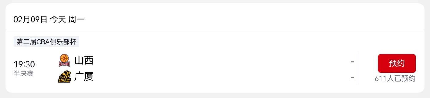 As per the schedule released by the organizing committee, the CBA Club Cup semifinal between Zhejiang Fangxingdu and Shanxi Fenjiu will be held tonight at 7:30 PM.