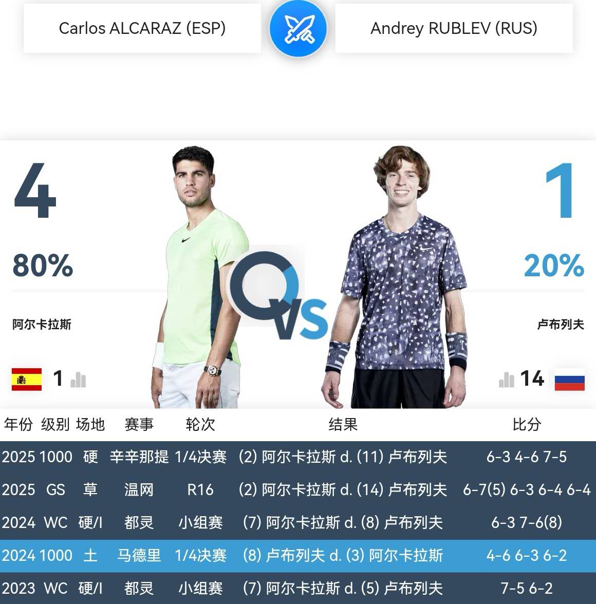 After a hard-fought victory over 2024 champion Russian thunder Khachanov in the quarterfinal early today, Alcaraz will face a tougher challenge tomorrow at 12:30 AM in the semifinal against defending champion, Russian "Golden Monkey" Rublev, making the competition even fiercer.