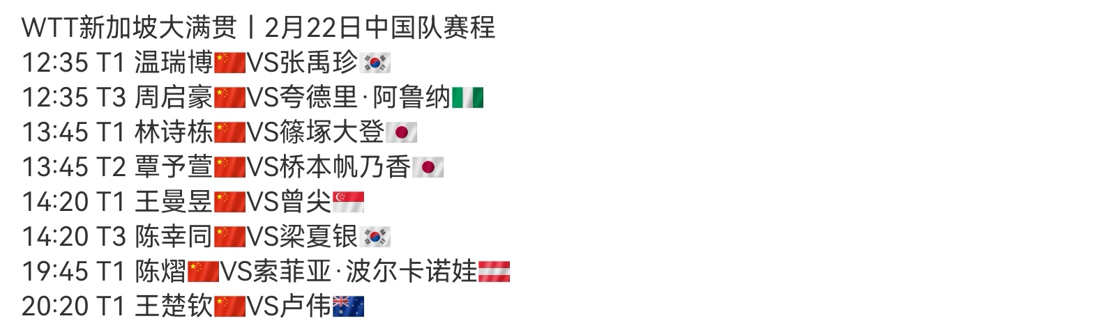 The WTT Table Tennis Grand Slam in Singapore has its schedule for today, 2.22, featuring Wang Chuqin and Wang Manyu, live on CCTV-5+.