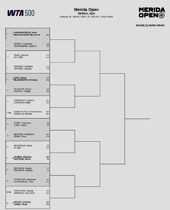 At the WTA 500 Merida, five Chinese players will compete in doubles: Tang Qianhui/Xu Yifan, Guo Hanyu/Muradnovich, Feng Shuo/Brooks, and Jiang Xinyu/Buksha.