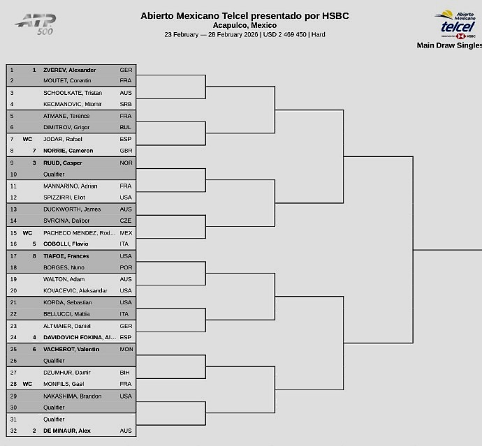 Looking ahead to next week’s tournaments: last night Beijing time, the main draws for upcoming events were released. The ATP 500 Acapulco will be led by German star Zverev and Australian rising talent Deminal, with players like Ruud, Dimitrov, and Vachero also competing.