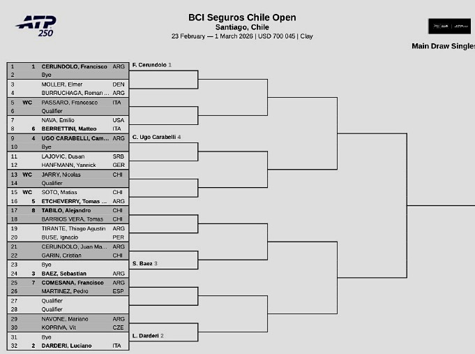 The top two seeds at the ATP 250 Santiago event are Argentina’s F. Cerundolo and Italy’s Darderi, with players such as Berrettini and Echeverry set to compete for two consecutive weeks.