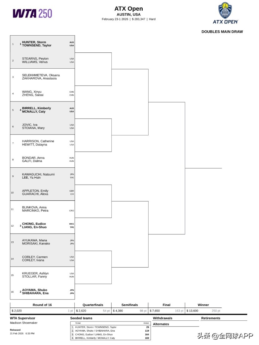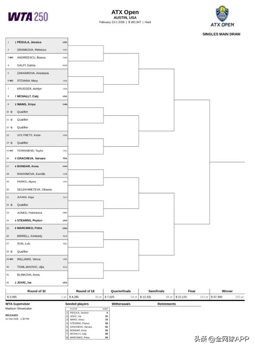 The 2026 WTA250 Austin draw is out, with Wang Xinyu as the sole Chinese player directly entering the singles main draw by ranking, seeded 3rd in the upper half. She will face qualifiers in her opening two rounds. Previous champion Yuan Yue aims to secure a main draw spot in the early hours tomorrow.