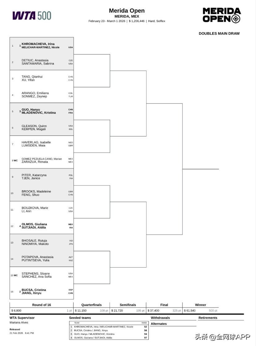 The main draw for the 2026 WTA500 Merida event has been released. Paolini, who has struggled recently this season, received a late wildcard and will compete as the top seed, sharing the spotlight with defending champion and second seed Navarro. Lee Ji-ni and Buzkova are seeded third and fourth respectively, with the top four seeds receiving byes in the first round.