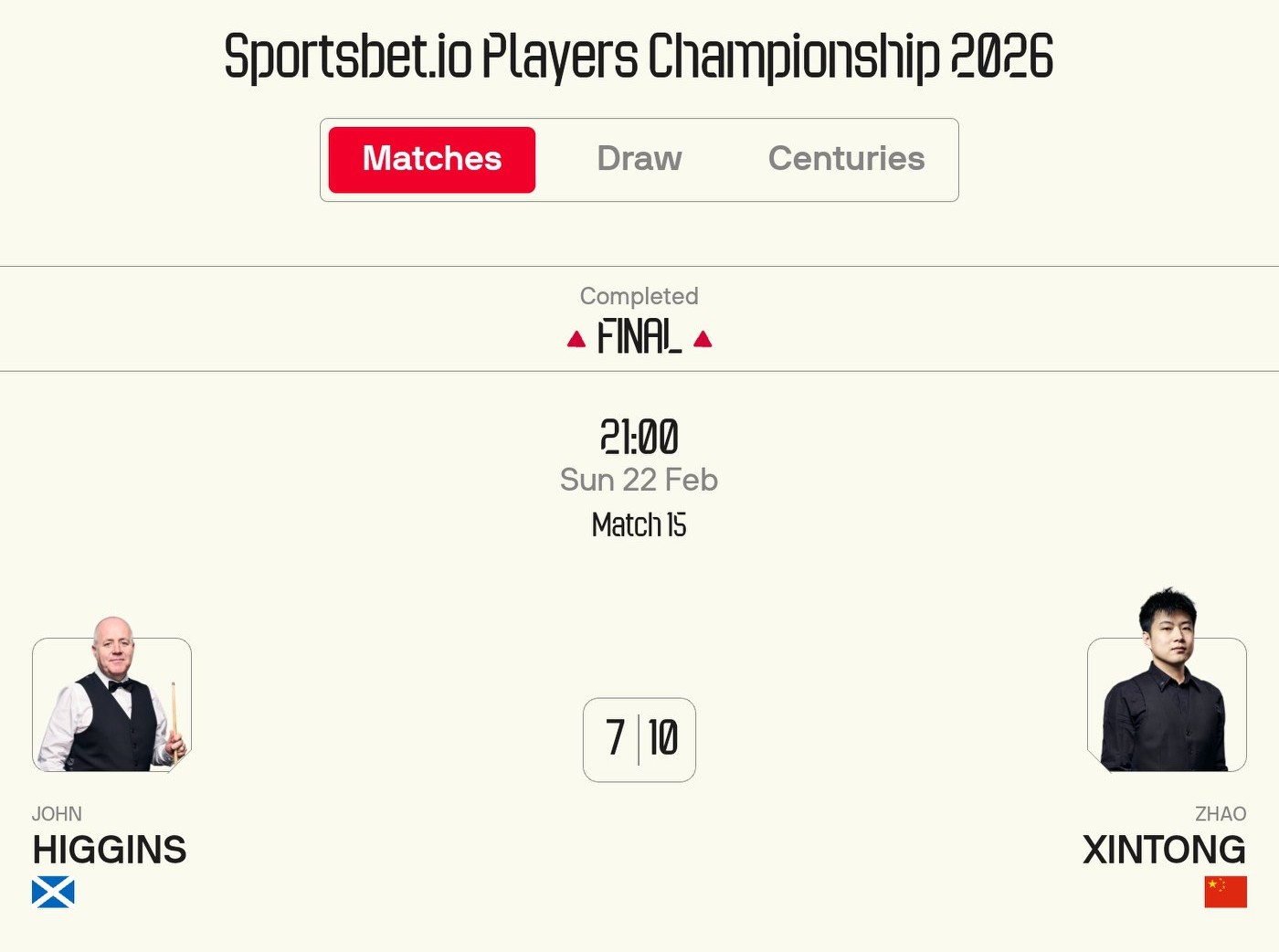 The latest update from the Snooker Players Championship reveals that Zhao Xintong beat Higgins 10-7 in the final, capturing back-to-back ranking titles and accomplishing an extraordinary feat this season.