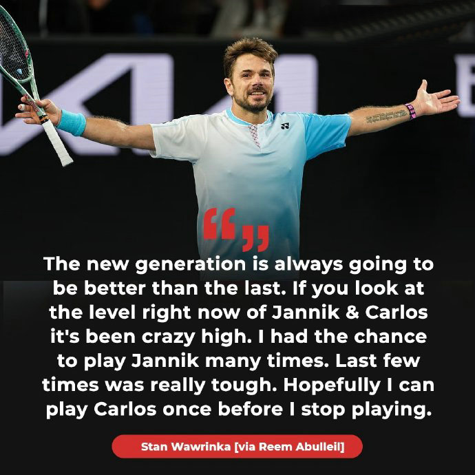 Other matches: Former champion and Swiss veteran Wawrinka opened with a 7-5, 6-3 win over Lebanese player Hassan. After this match, Wawrinka set a new record as the ATP player with the most tour wins (10) after turning 40. In an interview, Sijian said he hopes to face world No. 1 Alcaraz in his final season, stating, "The new generation is always stronger than the last. Look at the level of Yannick and Carlos now — it’s astonishing. I’ve had many tough matches against Yannick recently. I hope to play Carlos once more before I retire."