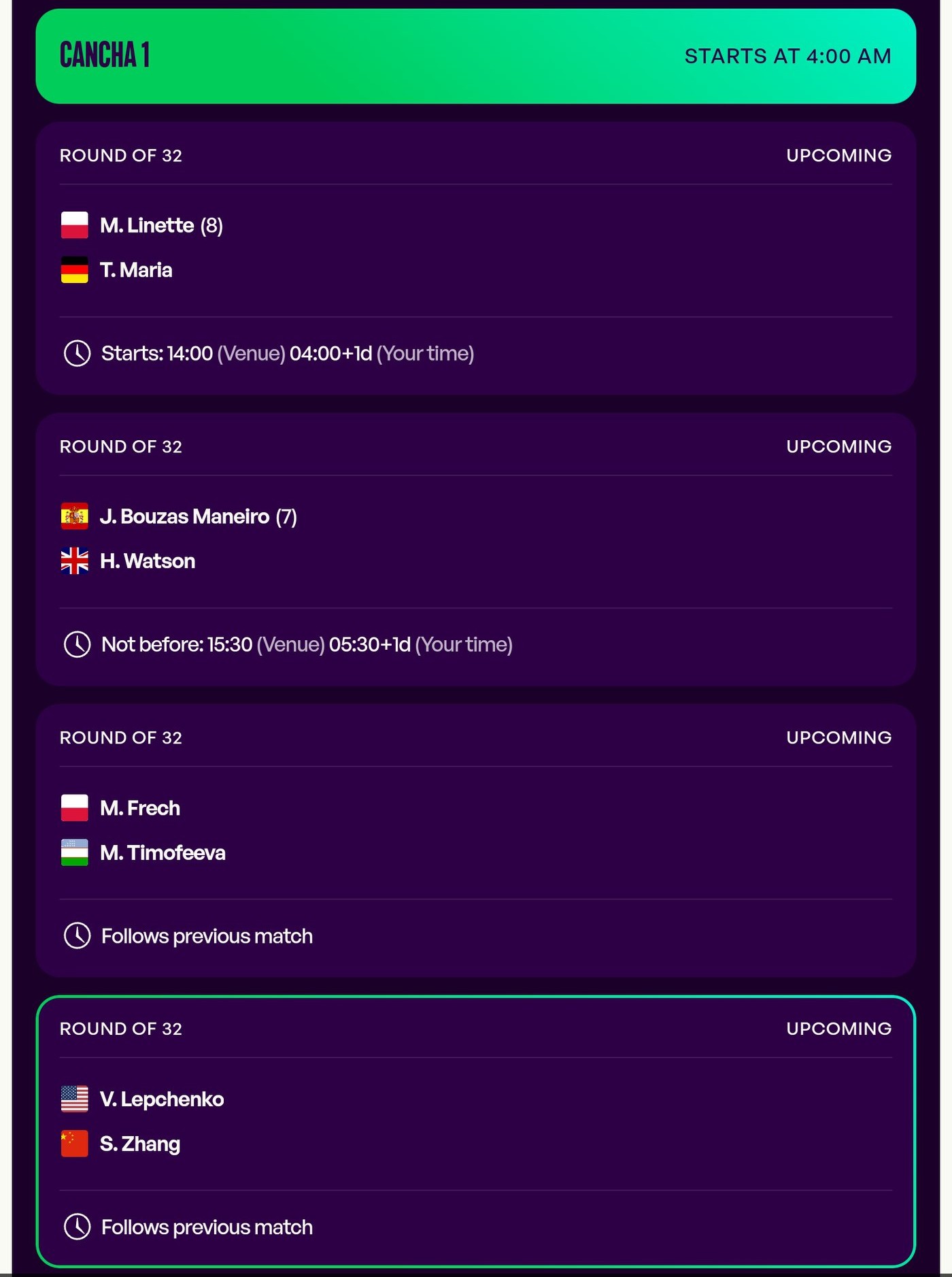According to the schedule released by the WTA official site, Zhang Shuai will face Lepchenko at approximately 7:50 AM tomorrow.