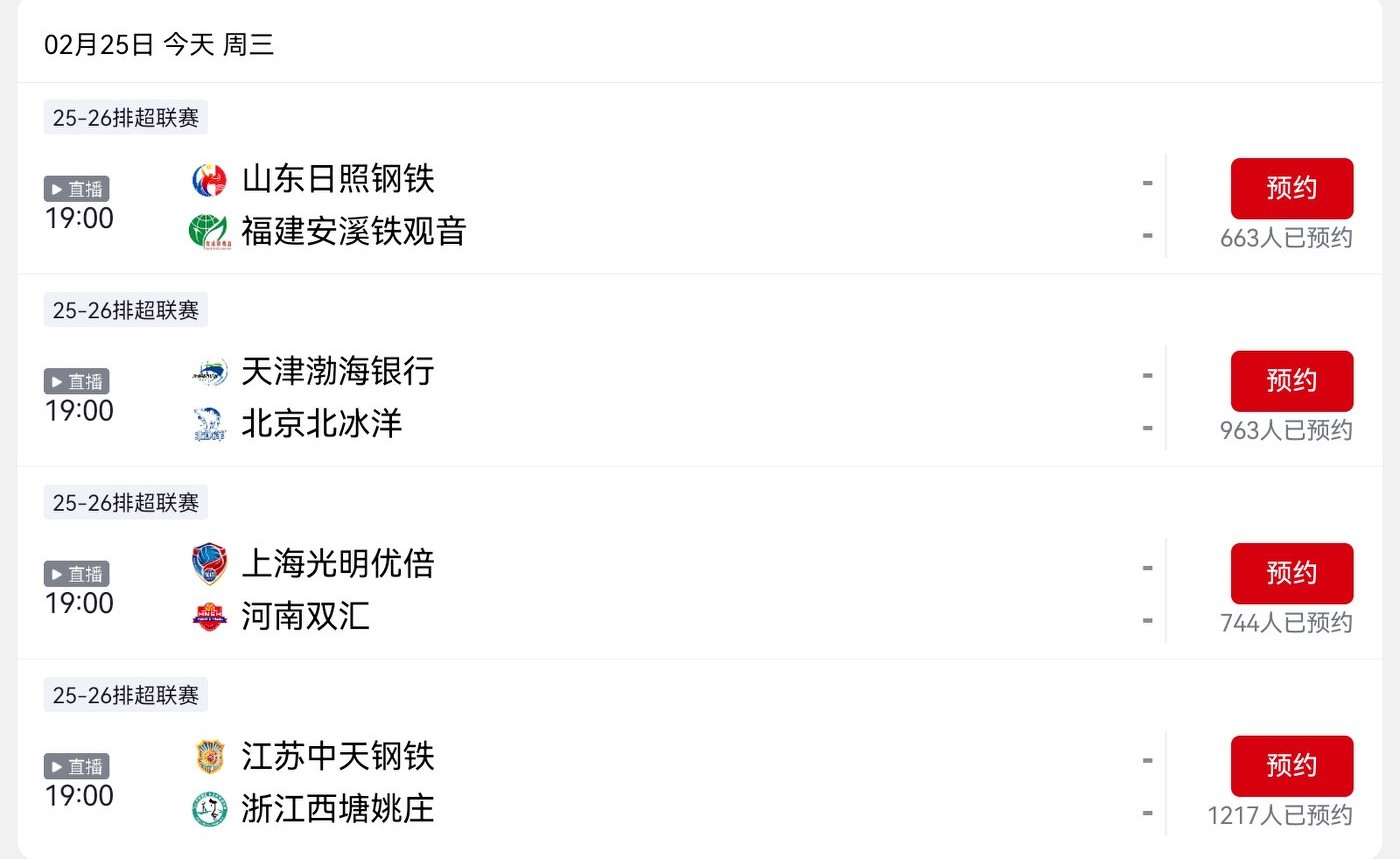 The Women's Volleyball Super League schedule for today (2026.2.25) includes four matches, all live on CCTV Video.