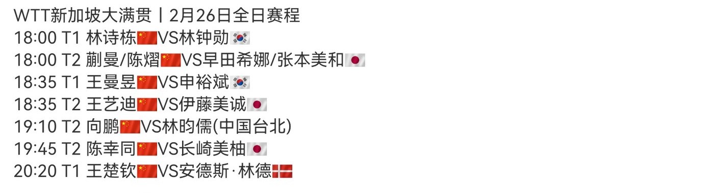 The WTT Grand Slam Singapore event schedule for tomorrow (2.26) features Wang Chuqin and Wang Manyu competing, with live coverage on CCTV-5+.