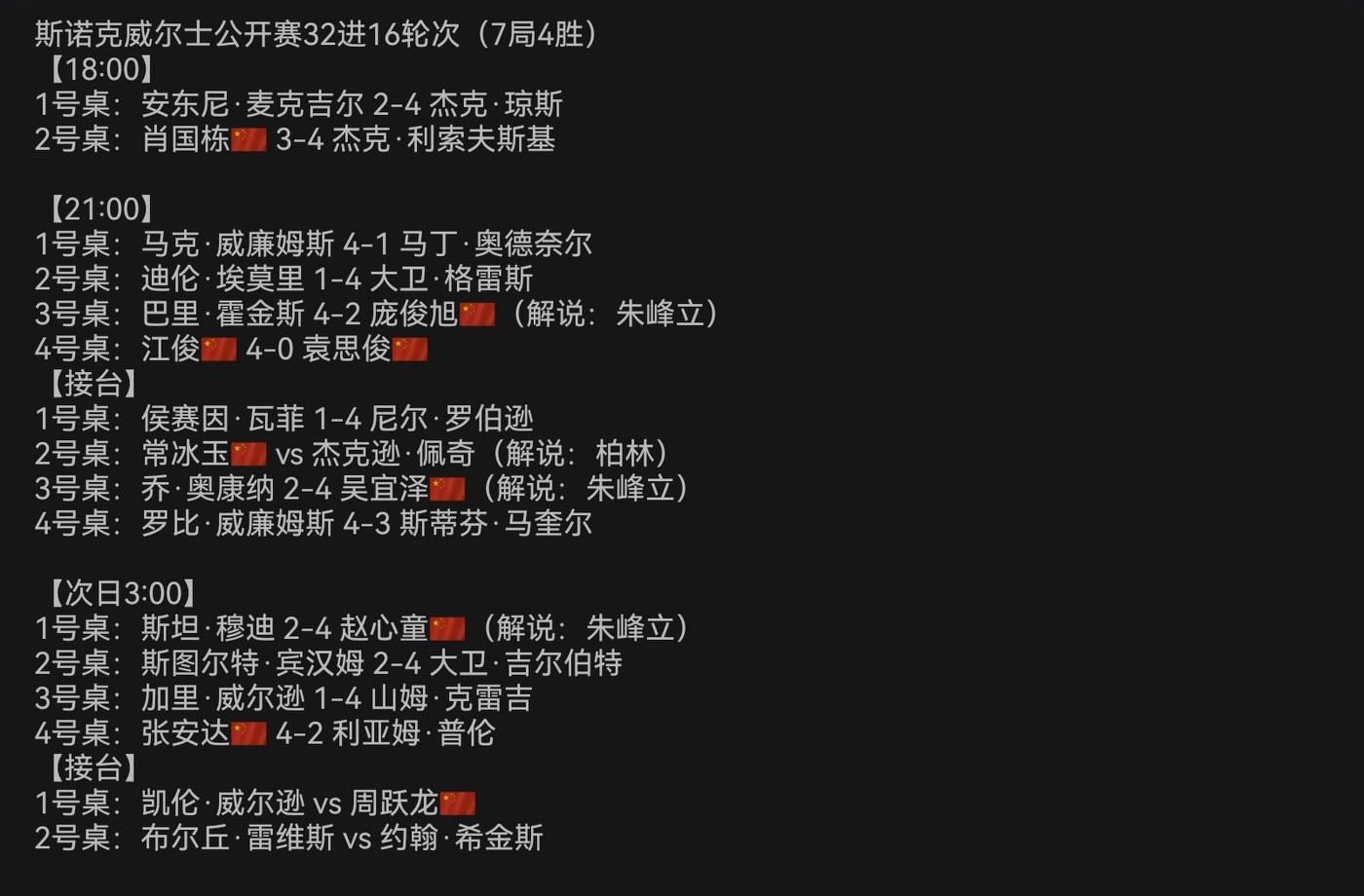 First of all, congratulations to Zhao Xintong, Wu Yize, Zhang Anda, and Jiang Jun for advancing to the last 16 early, and we also look forward to Zhou Yuelong winning his match to join them.