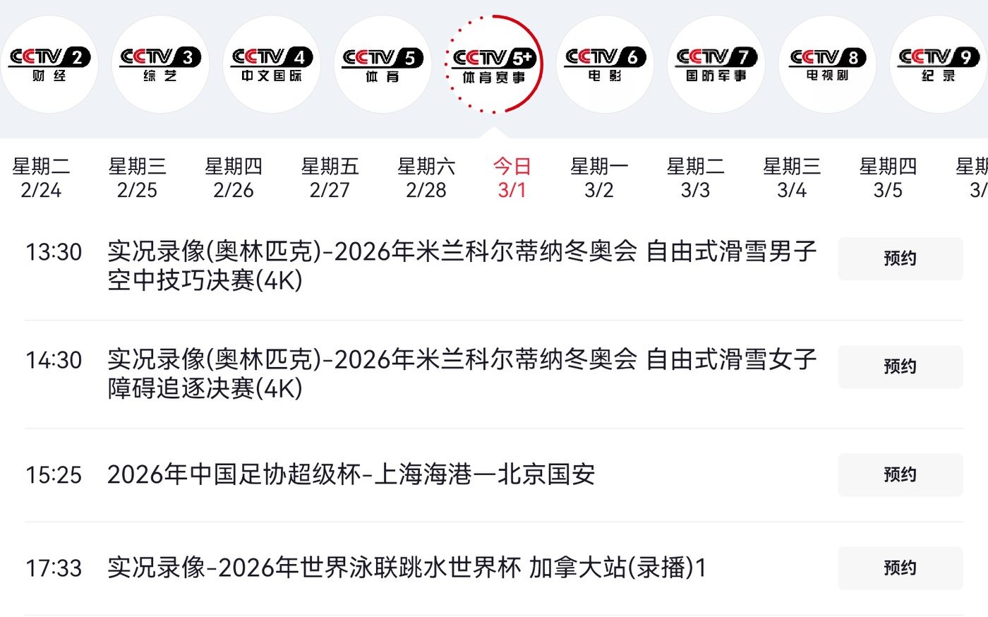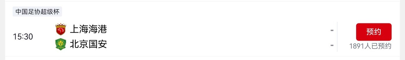 The Chinese Football Association Super Cup schedule for today (March 1, 2026) is Shanghai Port vs. Beijing Guoan, live on CCTV-5+.