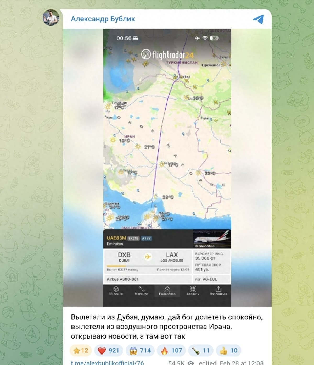 However, this route brought him into a close brush with war."When we left Dubai, we thought: 'God willing, this flight will be safe,'" Bublik recalled on his Telegram channel. "We had just left Iranian airspace when I checked the news and saw what was happening."