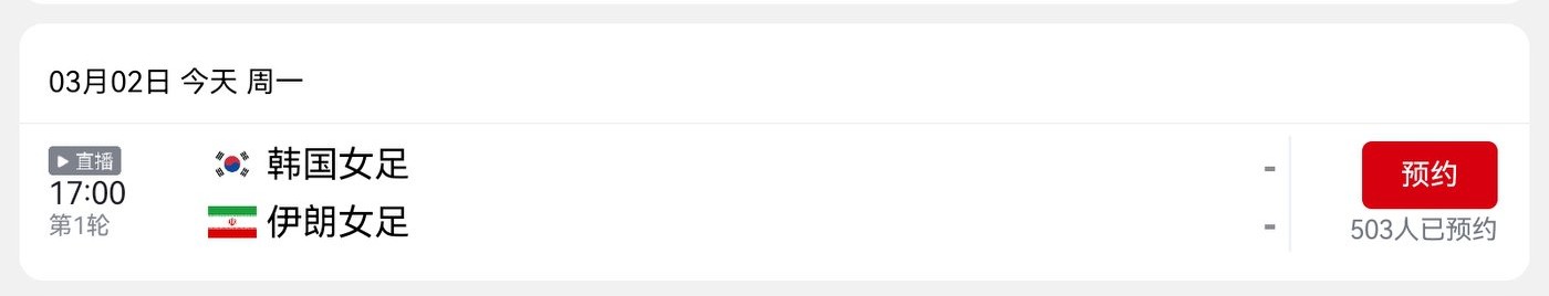 Today's (March 2) AFC Women's Asian Cup schedule: Iran Women's Football Team vs. South Korea Women's Football Team, live on CCTV-5+.